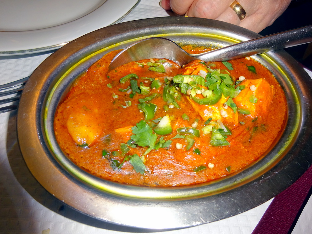 The Balti Gosh, Chicken Vindaloo, Plain Naan and Maggie’s Poisson Rajpout Special arrived first. The Fish Dish turned out to be a Biryani. Today, – Curry de poisson en sauce – would not feature any Masala. Dry as I prefer my Curry to be, I still like some Masala.