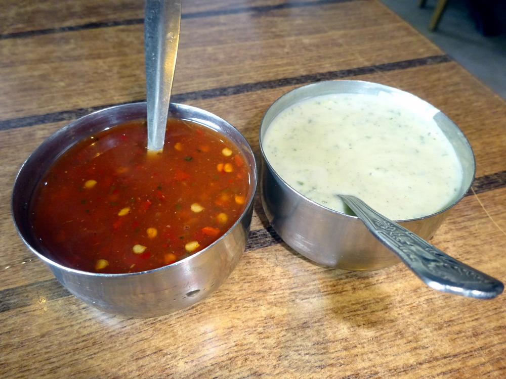 I asked for – A bit more Spicy, but not crazy. Marg would take it as it comes. Marg ordered a Mango Rubicon but sent it back when it came. The Bottle of Tap Water was deemed to be sufficiently cool and refreshing. Raita and Chilli Dips were provided, for what I was not sure, no Poppadoms.