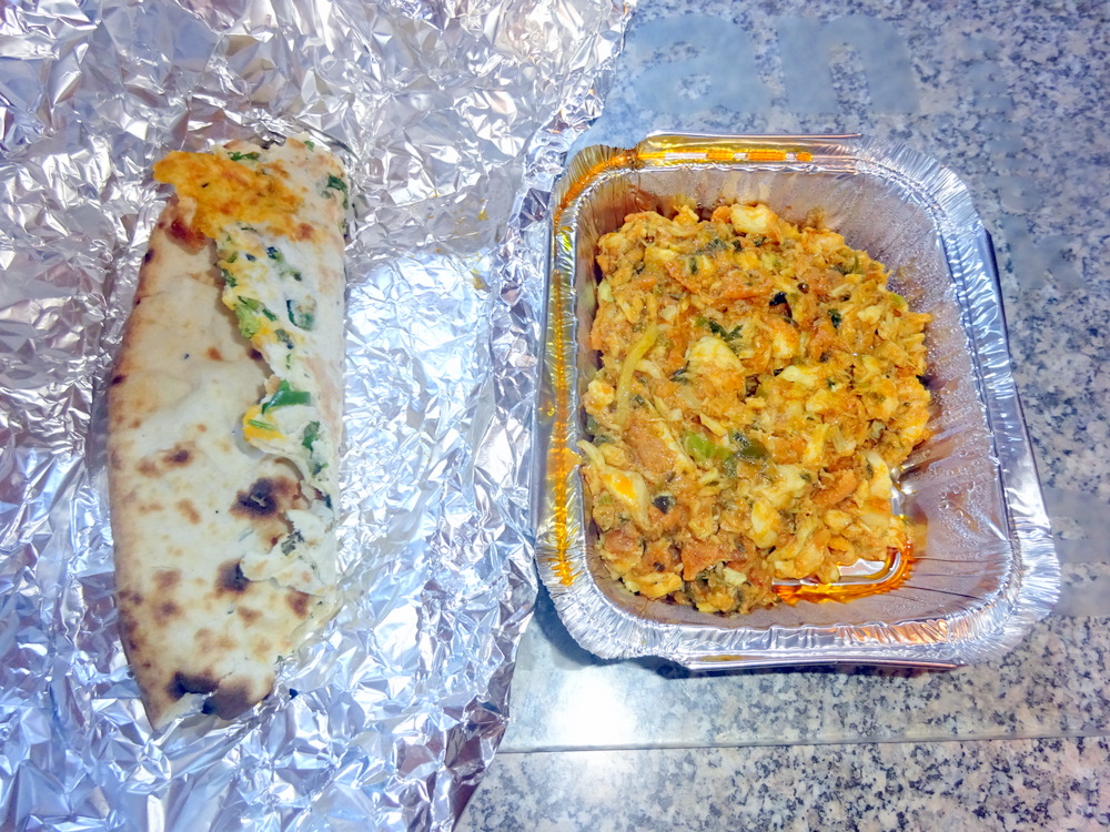 The Regular Portion was Substantial as I have described previously. The Large was enough for two, I knew some was coming back to Glasgow from the outset. Hector’s Takeaway. The Chilli and Coriander Naan sat atop the Roti. The Naan was round, and more importantly – whole. It looked as if it was Tawa cooked not Tandoor, no telltale – tear shape – or enough burnt blisters. The Naan was lightly fired, soft, not doughy, very appealing. The Chillies would give their bite, tempered by the Herb. Marg marvelled at the size of her Roti which she managed to eat in its entirety. The Roti also did not turn to – Crisp – too soon. Half Chapatti, half Roti?