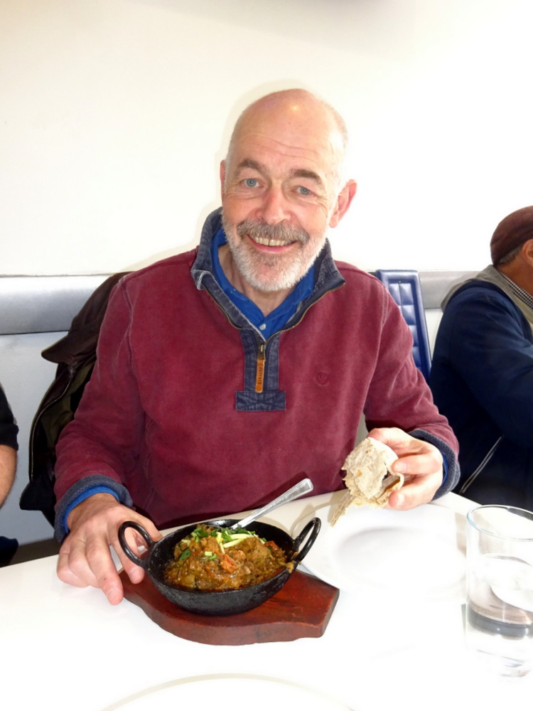 Marg drove us to Tradeston. She had been telling us all morning how hungry she was, but with dinner planned at home later, Marg was determined not to overdo it. Qaiser provided a Menu, Mince Samosa Chat (£3.50) was Marg’s choice. Dr. Alasdair followed Hector’s lead. He is a fan of Lamb on the Bone, so Lamb Karahi (£8.90) with extra Methi and a Chapatti (£0.70) was ordered, twice.