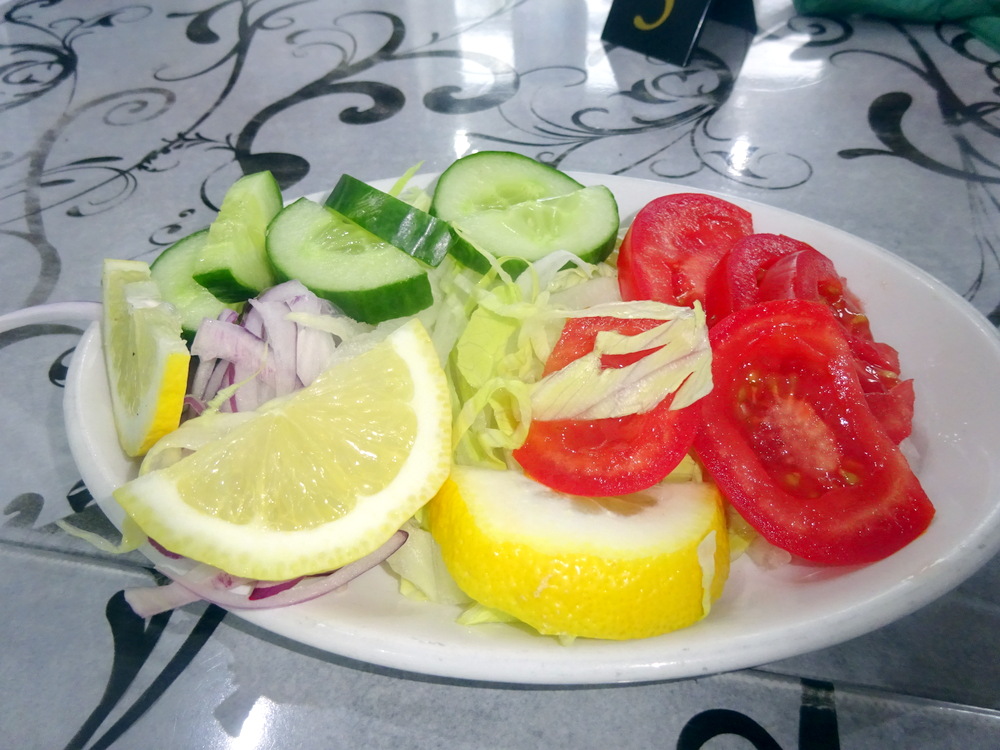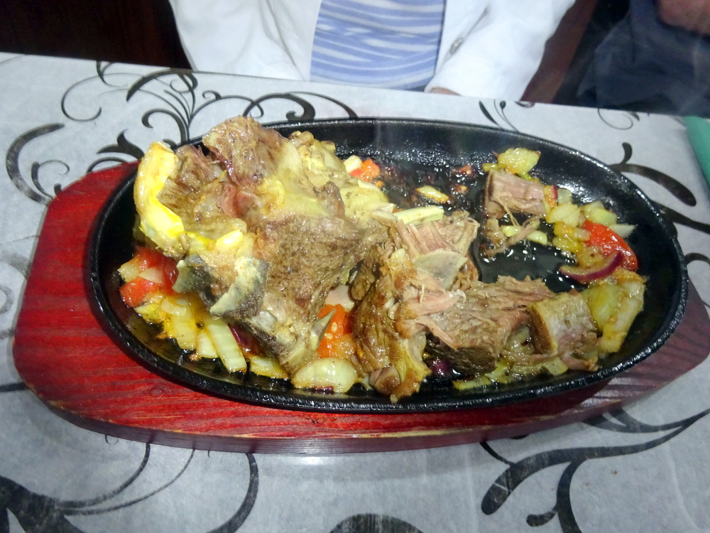 This is a Dish of many parts. First to arrive was the Salad featuring Lemon Slices. Then the main part of the meal, pieces of slow-cooked Lamb on-the-bone sizzling on a metal platter with Tomatoes and Onions being done to a frazzle. One then decants pieces of the Lamb to a plate with Boiled Rice and Rice Vermicelli.