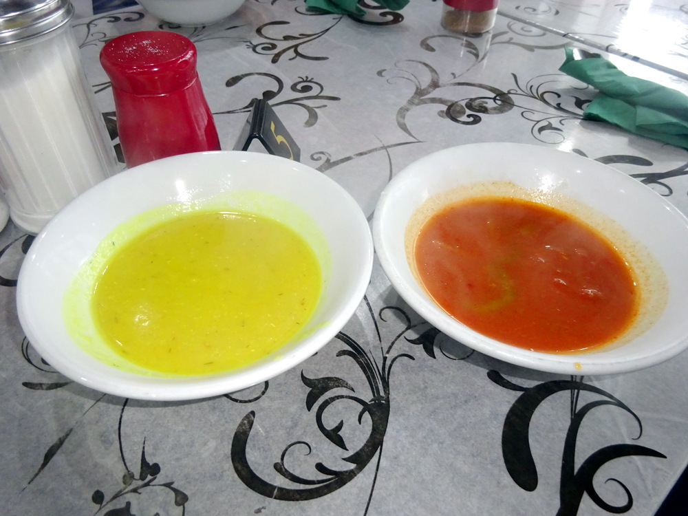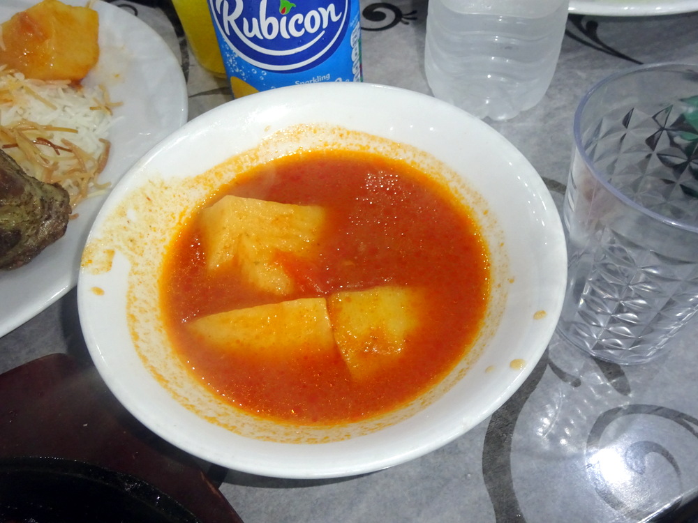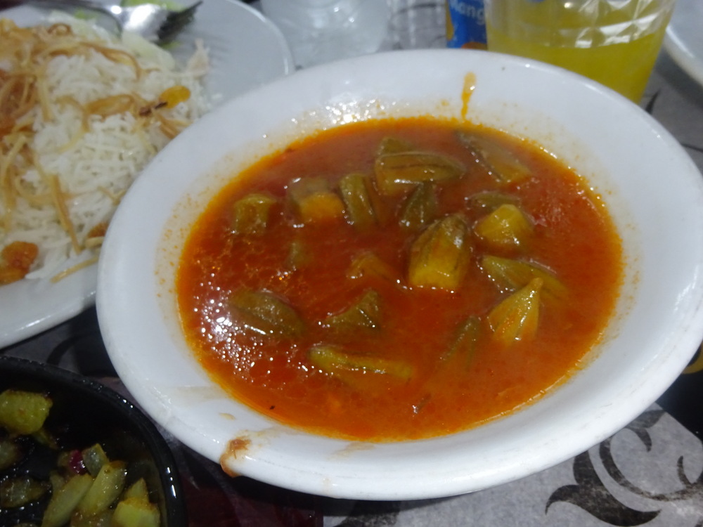 The Naan arrives separately in this Dish which is the biggest difference between Qozy and Tashreeb. We had four plates of Rice and four freshly made Naans on the table. Last time I was offered a choice of Vegetables to accompany the Shorva, this time Mein Host simply brought out plates of Soup with Potatoes, Okra and Beans.