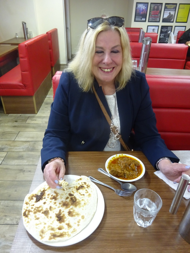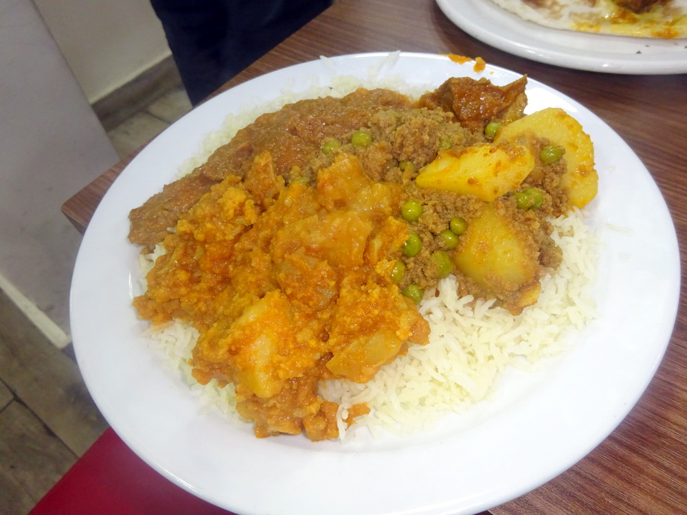 Mags and I were well through our – Comfort Food – when Dr. Stan showed up. Now we had a problem. The seats do not provide much room, how would we all squeeze in? Somehow we managed it. Dr. Stan had the Classic Manchester – Rice & Three (£6.30). His choices: Lamb Karahi, Keema Peas and Cauliflower Potato. The three of us sat in companionable silence, thoroughly enjoying our Kabana Curry.