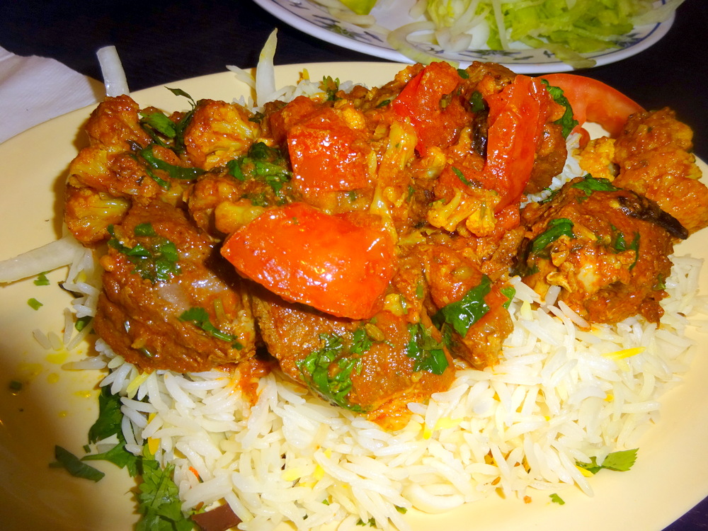 Five Large pieces of Fibrous Lamb were accompanied by a similar mass of Cauliflower. There was a lot of eating here. The Cauliflower was probably overcooked and did not give off the expected Flavour. The Lamb varied from Tender to Chewy but was decidedly edible. Initially the Spice Level was noted as – Low – this was revised upwards. This was a Curry which impressed the more I ate. The Seasoning was well judged, the Flavours slowly started to register. The Cinnamon had done its work, the Fresh Coriander and Onions added further Flavour and varied Texture.