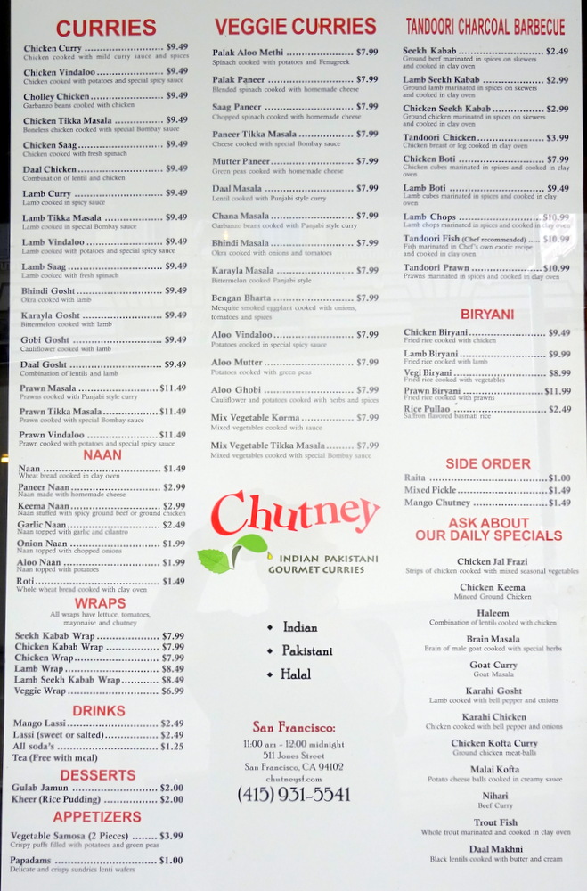 I had three venues already selected before arrival, Shalimar gave way to Chutney Indian Restaurant (511 Jones St, San Francisco, CA 94102 USA) across the street. When I saw it last night, I knew, this would be the venue for my first San Francisco Curry.