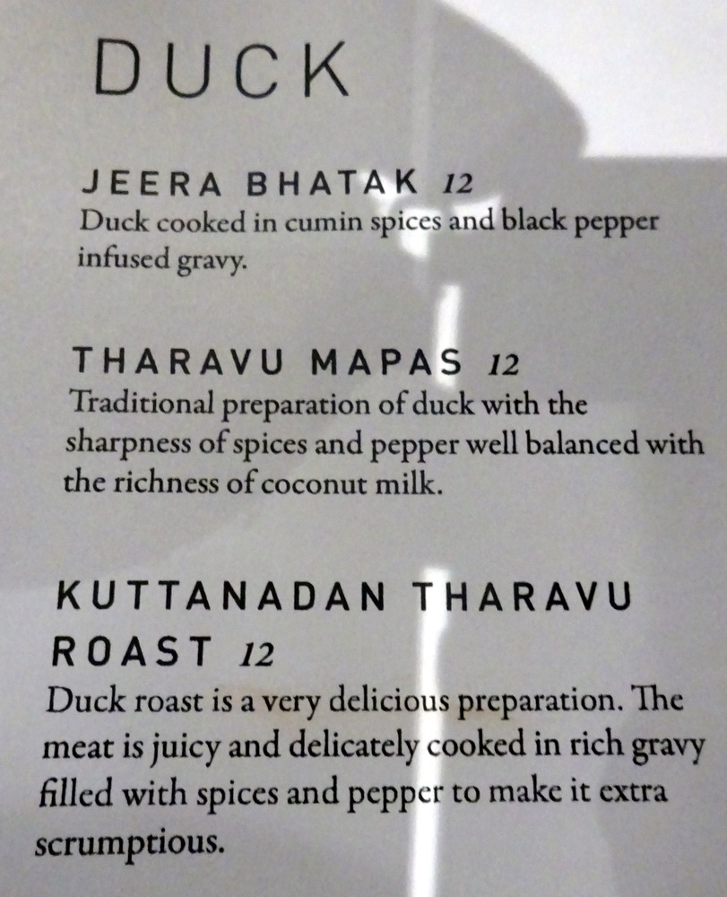 Machi Masala (£15.00) featured Salmon in a – thick delicately spiced tomato gravy. The promise of a Thick Masala was tempting, sourcing Quality Fish Curry in Glasgow is difficult. By the time I dismissed Capsicum and Coconut from the Lamb Dishes, I was left with Rogan Josh (£11.00), a possibility. Duck Curry? – a rarity in these parts. Kuttandadan Tharavu Roast (£12.00) sounded interesting, I would have to verify that it was actually – Curry. £20.00 for Nalli Gosht? Is it gold-plated?