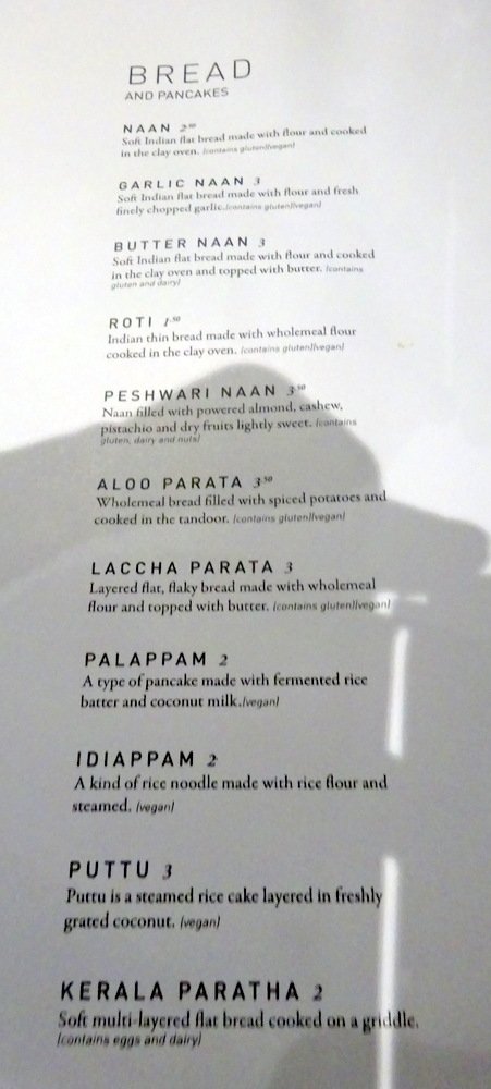 I was pleased to make his acquaintance. He let me choose my own table in one of the small booths on the far side of the rear room. In the course of our brief conversation he told me he is from Kerala. There are not a large number of actual – Indian Restaurants – in Glasgow. One day I will find a Chettinadu in Glasgow to match what I had in Seattle last weekend at Chili’s South Indian Cuisine. The Menu was provided. It was evident that this was not a Mainstream Menu, but a collection of well thought out Dishes.