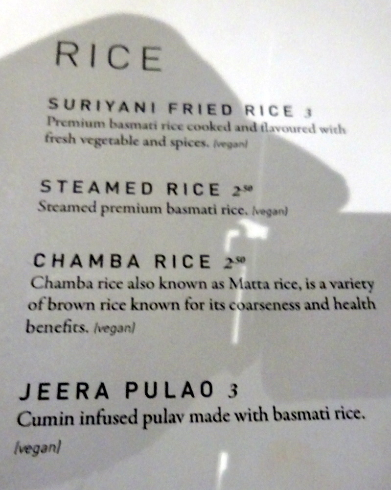 The wait was appropriate, not too long, not Curry in a flash. When it arrived, I was impressed by the sight of a Thick, Minimal Masala. The overall quantity was such that I could have done without the Chapatti. Nevertheless, this was a worthy Chapatti, good girth and soft. The Chamba Rice intrigued. This – Brown Rice – was White, Chubby, quite different from Basmati. It reminded me of the Orzo Pasta which is used by the Greeks in Giouvetsi.
