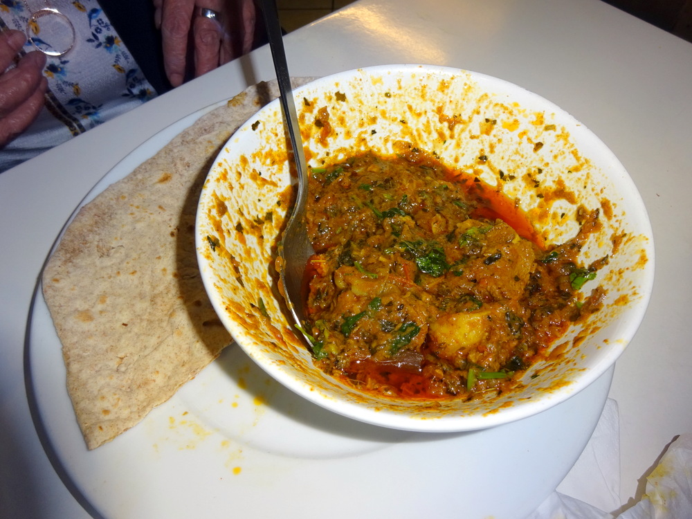 Ayaz, Mein Host, was back from his holidays, Chef Rashid was still on duty, this time Qaiser was missing. Lord Clive of Crawley joined Mags and Hector in the Karahi Palace (51 – 53 Nelson Street, Tradeston, Glasgow, G5 8DZ) ritual: Karahi Gosht (£7.90) for the Chaps, Aloo Gosht (£6.90) as always for Mags. Three Chapattis (£0.70) completed the Order. Ayaz took the order and hopefully noted the tweaks: extra Seasoning, extra Methi.