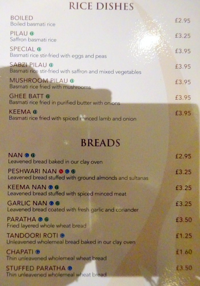 Marg was set to order her now customary solitary Chapatti (£1.60), however, I persuaded her to adopt our usual system of sharing Bread and Rice. With the Vegetable Side there was no need for exotic Rice, Boiled (£2.95) would suffice, plus a Paratha (£3.50).