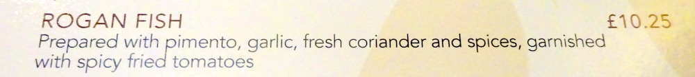 The Fish Rogan was pleasant to eat, enjoyable, and remarkably light. I wouldn’t rush back to Loanhead to have this again, however, later in the Menu (below) was – Garlic Fish – the description of which now intrigues. How many Herbs? Which Herbs? Would Hector have his Methi?