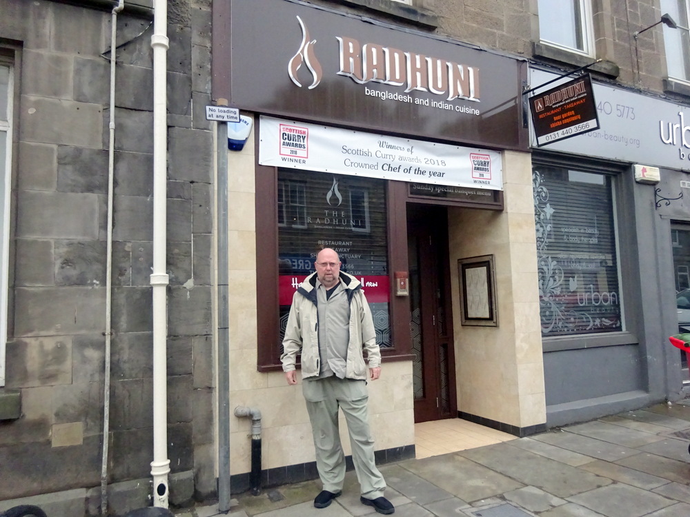 Our booking at The Radhuni was for 18.00. Having to avoid Glasgow’s city centre due to the Cycling, part of the ongoing European Championships, meant using the M8 just as the football traffic was building up around Ibrox. We arrived at 18.20. The final stretch from the Edinburgh Bypass was quite familiar, Marg and Hector were here last year when we finally got around to visiting the now – World Famous – Rosslyn Chapel which is only minutes from Loanhead.