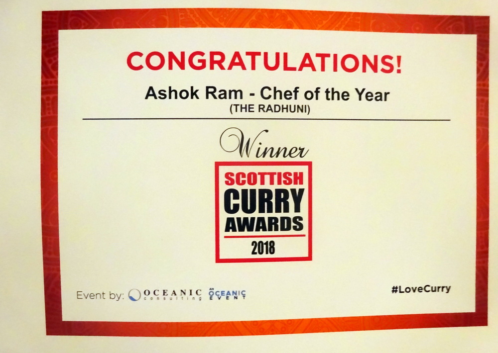 It is – The Glorious Twelfth – Hector and Marg are dining at The Radhuni (93 Clerk St, Loanhead EH20 9RE Scotland) in the east of Scotland. In the aftermath of the 2018 Scottish Curry Awards, Scott of – Hotels PR – contacted Hector, an invitation to visit and review The Radhuni was forthcoming. The Chef, Ashok Ram, had just won Chef of the Year (Industry Choice). This is not to be confused with Taj Tandoori (Prestwick) who won Chef of the Year (Voter’s Choice) and was the locus of Hector’s last Scottish Curry a mere week ago. Who wins Awards?