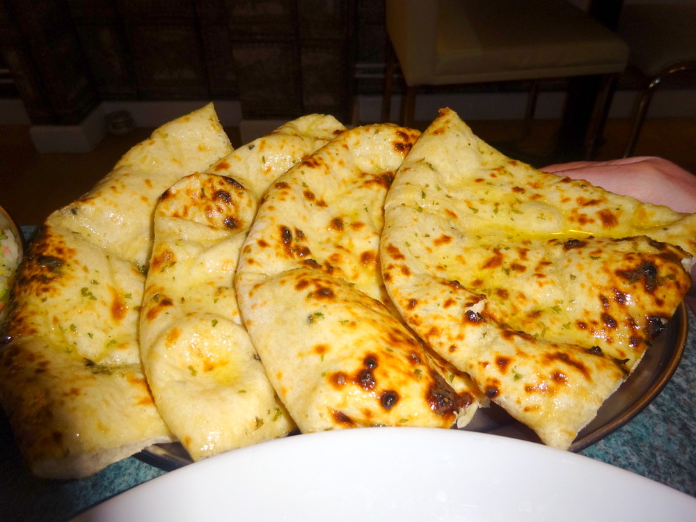 Tonight’s Garlic Nan was served Quartered, which took the edge off the presentation. Somehow Steve became more interested in my Paratha than his own Naan.