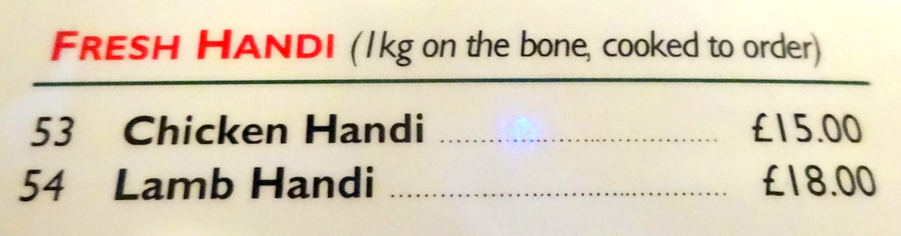 Once again, the first thing on the Menu which caught Hector’s eye was the 1kg of Lamb Handi on-the-bone (£18.00). Unfortunately, two hours notice was required. Tomorrow, anyone?