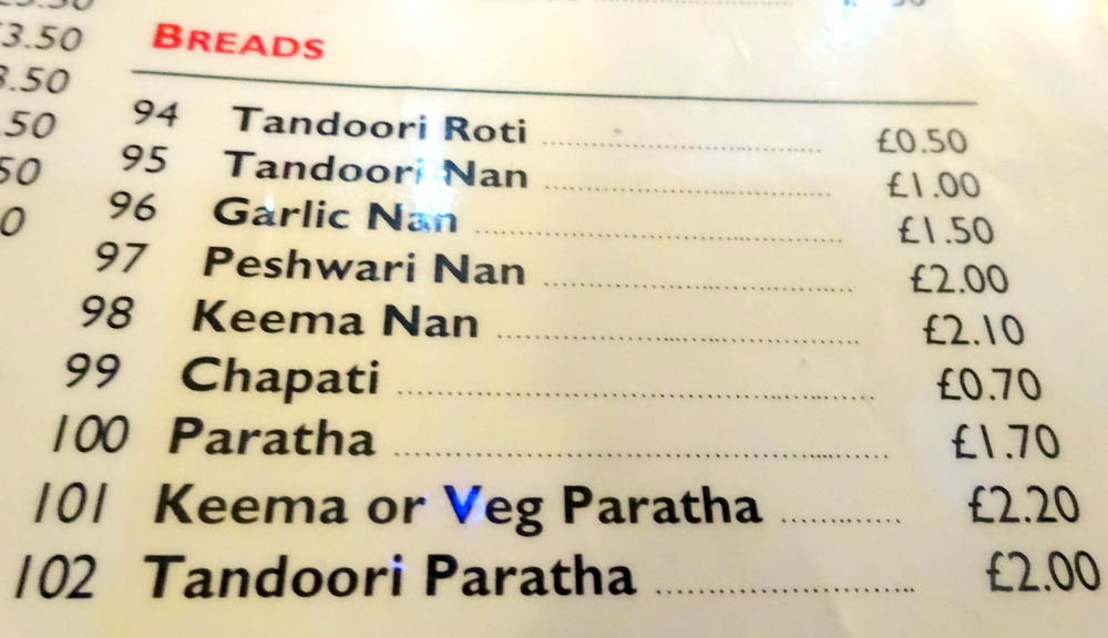 Wow! – does not begin to describe them, and they were served – Whole – which makes such a difference. The Plain Paratha was – Piping Hot – and showed definite signs of Layering, it had Girth, was clearly Flaky, and the inner core revealed the – Swirl. The Keema Paratha was seriously Thick, it had to be opened to check the interior. The Meat, not in separate grains, was far from being pink, and not the horrible – Donner-like – Keema served at too many outlets. At this point Mein Host recalled that I had made such an examination last year. He suggested I had the Desi Special Nan (£3.10) which is no longer on the Menu, having been lost in the reprint. That Naan featured Cheese, the Portuguese customers apparently liked the Cheese. Hector order a Cheese Naan? Records show I had the Keema Nan.