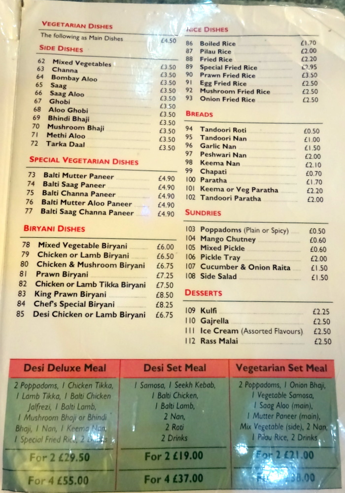 I asked the taxi driver what his favourite venue was in this part of Peterborough. Lahore Tandoori Restaurant (539A Lincoln Rd, Peterborough PE1 2PB) was the reply, he offered to take us the couple of blocks beyond the Desi. Hector would stick to the original plan, that is one is for another year. I also asked about the Punjab Balti & Pizza House, he thought it had changed hands. That would explain a lot.