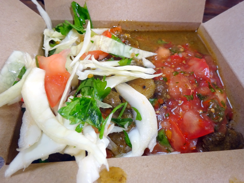 Yesterday I realised Viva Goa has gone leaving Embe2go (1 Cattle Market Rd, Peterborough PE1 1RJ England) as the sole supplier of Curry at the Market. However, Hector was eating Thai Cuisine courtesy of Oakham Ales. The plan for a Noon Lunch today was to sample the Goat Curry advertised on the Board outide the market perimeter. On asking for this I was told it would be Mutton Curry (£5.00).