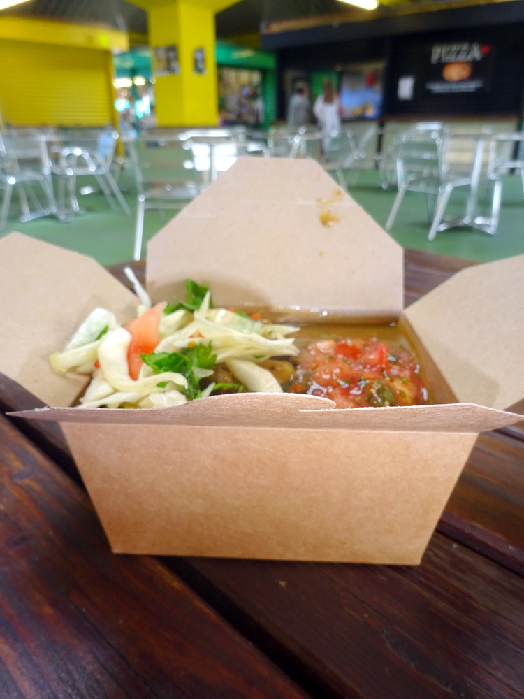 We were presented with Rice in a cardboard box, topped with Meat and Gravy. This had then been covered with Salad and Beans, something different. The cardboard box was a first, perhaps this is the way ahead given the present bad publicity plastic gets.