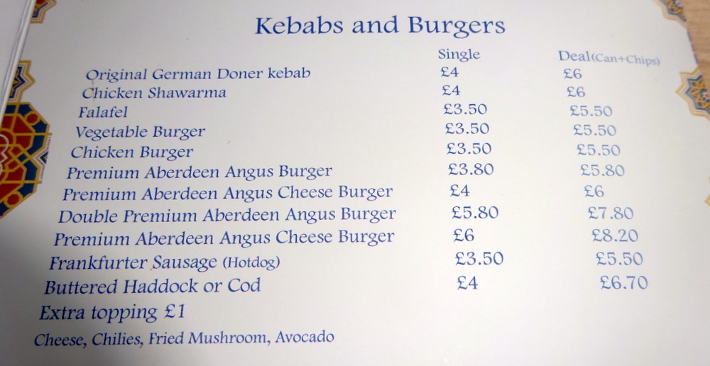 Fattah greeted me as I walked in the door. I had the choice of every table, it would be another thirty minutes before more customers arrived. This remains my preferred time of day to eat. Our conversation from Friday continued. Union St. is a main Glasgow thoroughfare with a line of Bus Stops outside the Restaurant. The scaffolding on the adjacent premises has been in situ for years. Rumours of a new Hotel being built remain just that. More scaffolding across the street makes Union St. a sorry sight. This should be an excellent location for a Restaurant which sells Pizza, Kebabs and Burgers in addition to Mainstream Curry Dishes.