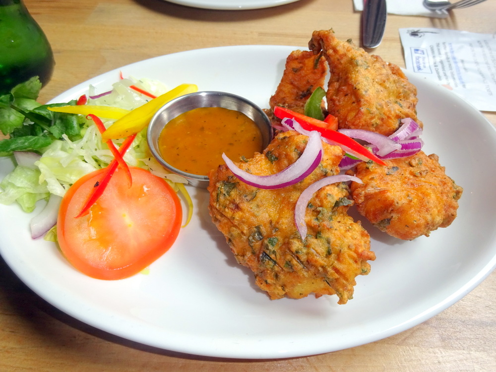 Chicken was dismissed – I stick to Lamb or Fish. This struck a chord, Fattah informed me that they had just taken a delivery of Fish today, Fisch-Heute? A Fish Curry was mooted. Who would have which Curry? Fattah suggested we share. What is it with sharing? Is this becoming an acceptable custom? I asked for a Paratha (£2.50) to accompany, Fattah then listed other options. Dr. Stan would have a Spicy Vegetable Paratha (£3.00). We agreed to share a Starter – Fish Pakora – (£4.50).