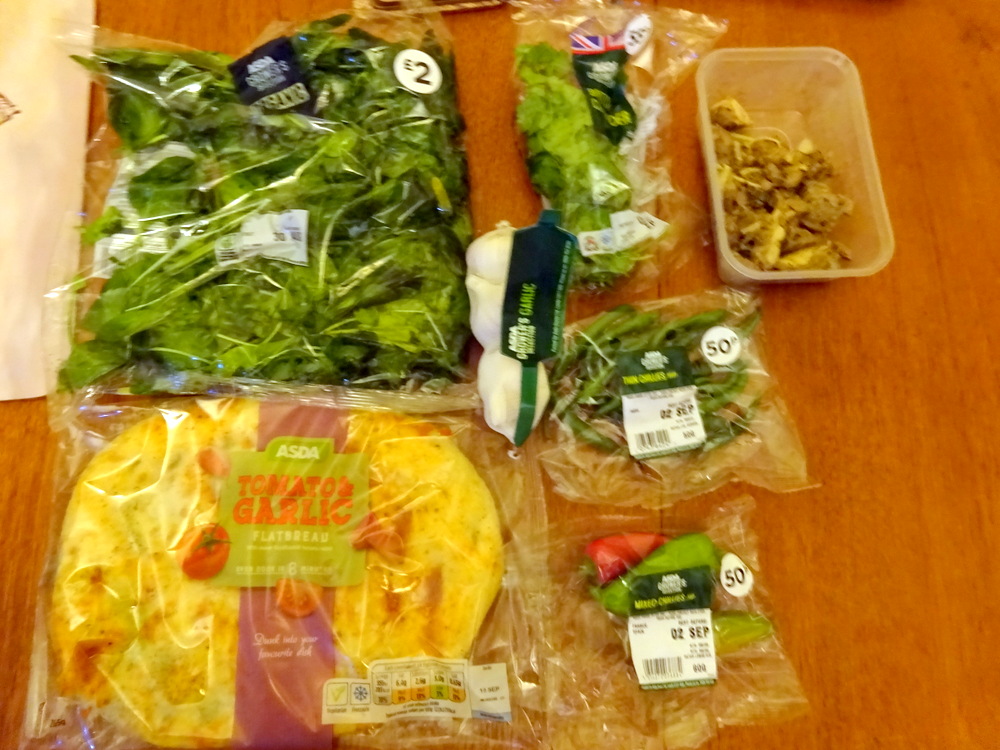 I needed Green Chillies, both types, plus Bread to accompany, this is not a Curry for Rice. A midnight raid on ASDA proved to be very fruitful, a big bag of Spinach for another time plus an Interesting Bread – Tomato and Garlic Flatbread, a first.
