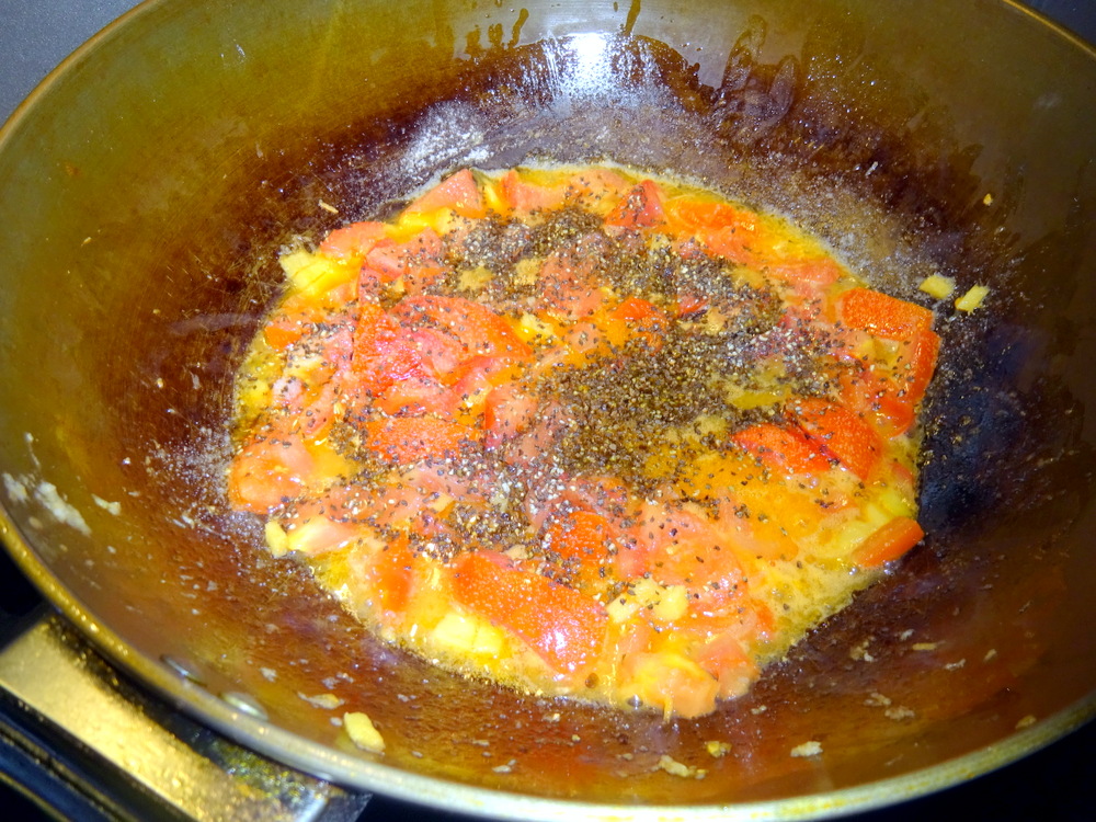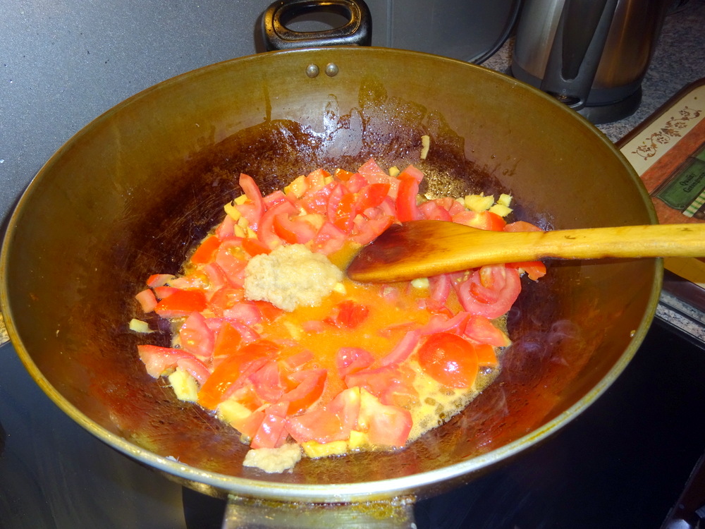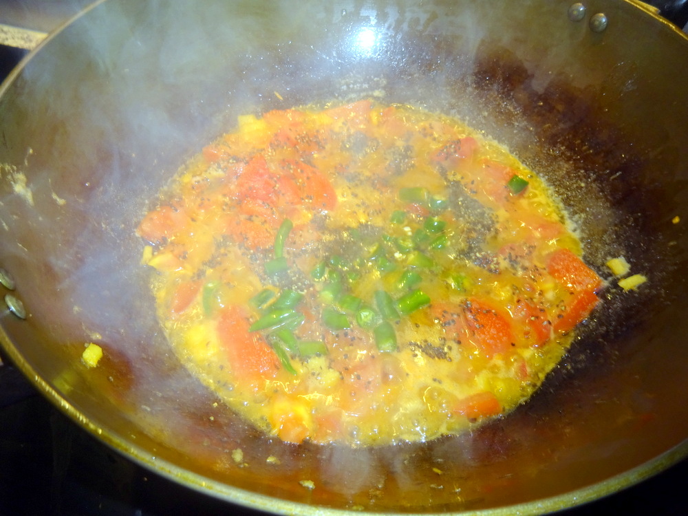 The Five Fresh Tomatoes, Garlic, and Ginger went into the Karahi, it was strange not having Onions. More Chopped Green Chillies (the thin ones) than I would ever have got away with if Marg was having some, was the final Vegetable. Salt and Coarsely Ground Black Pepper were the only other additions at this stage to maintain the tradition.