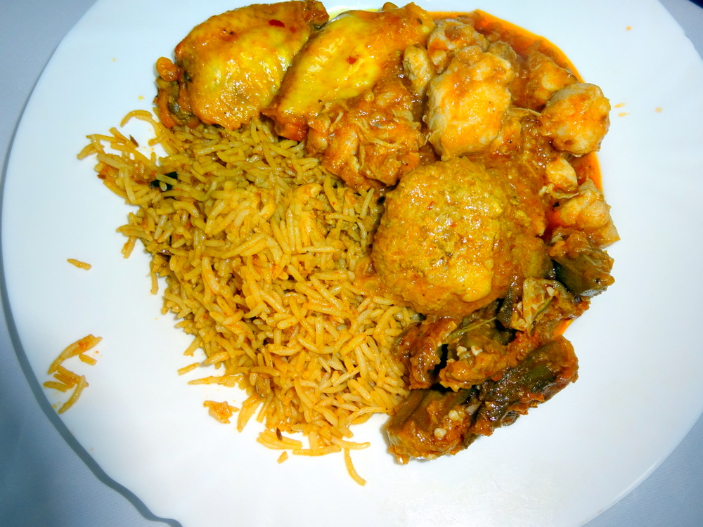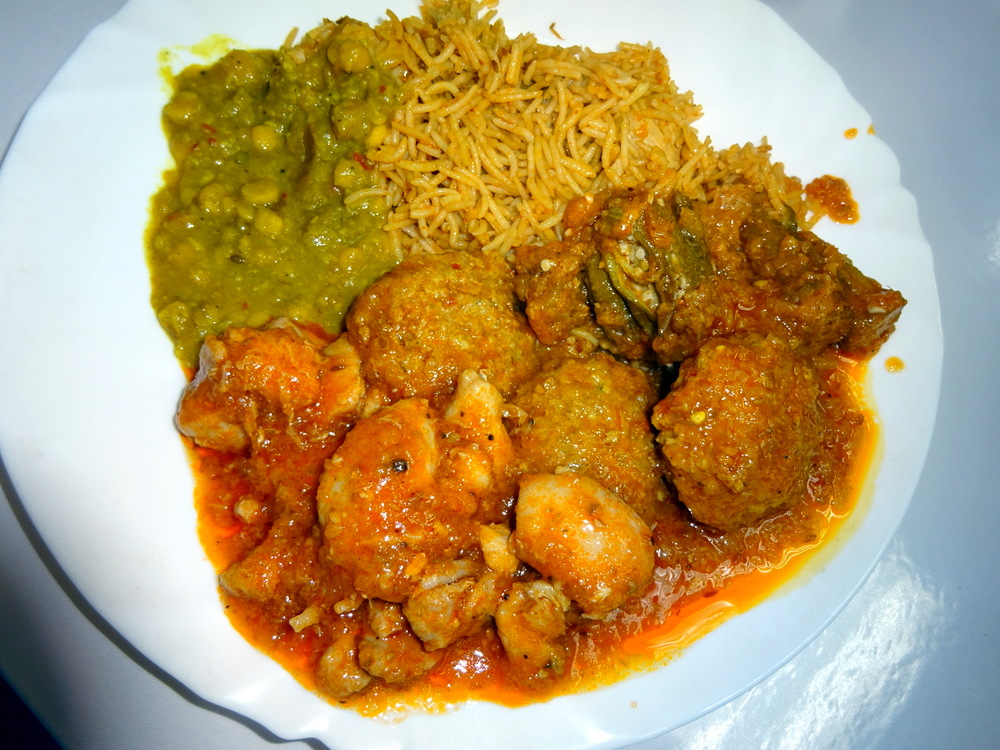 Chicken Wings and what looked like a Biryani were the first trays encountered. I put some of each on Mother’s plate, the Rice only on my own.