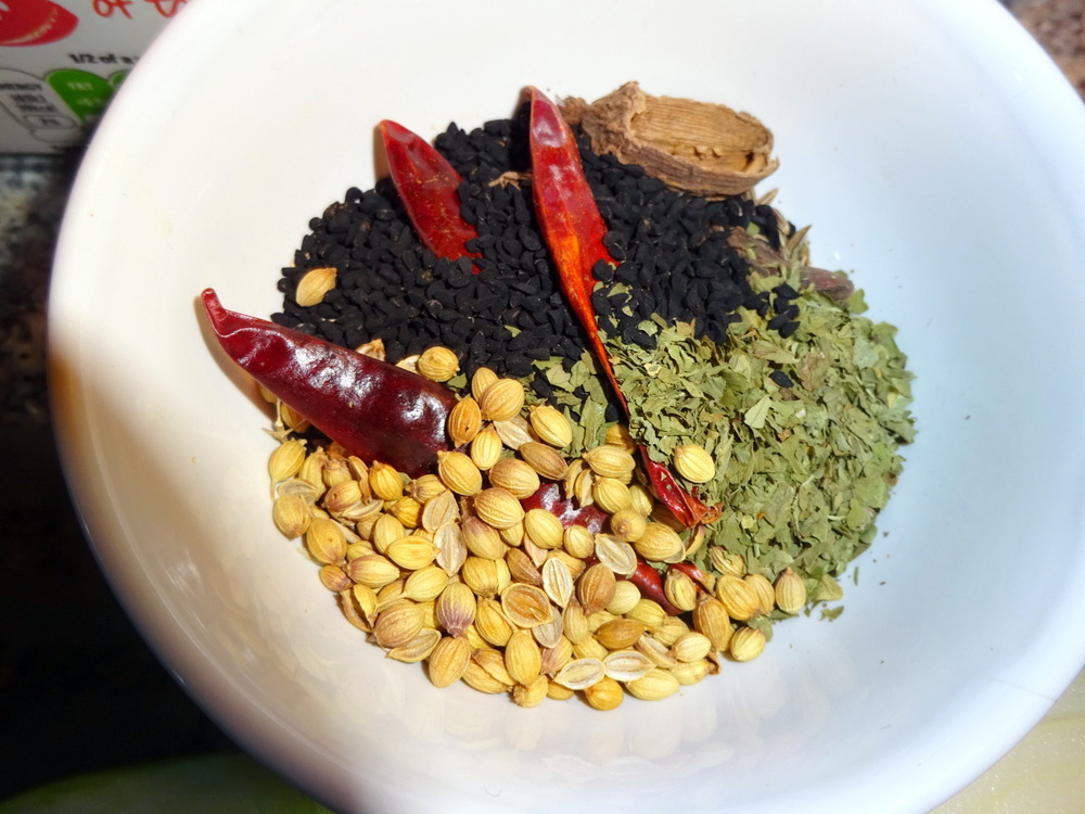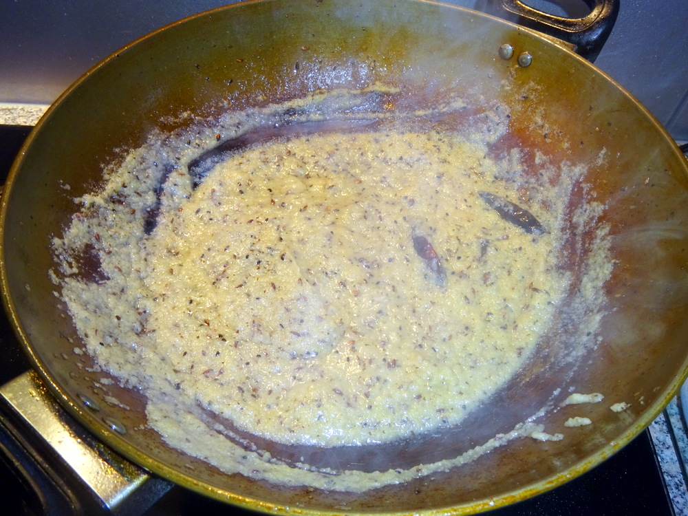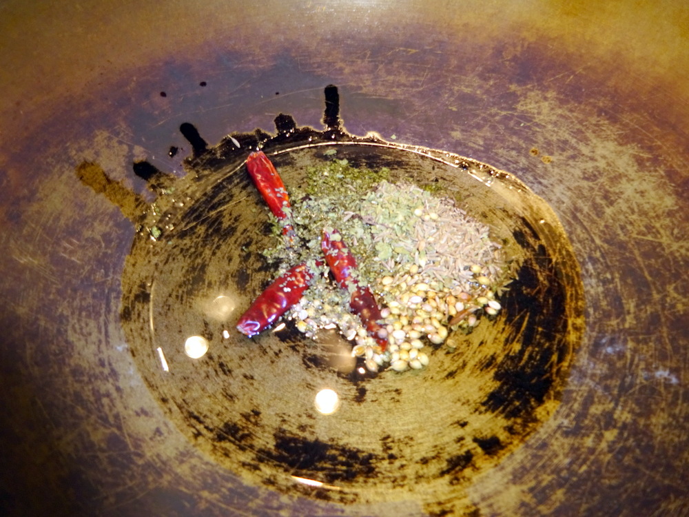The Solid Ingredients: Smoked Red Dried Chillies, Cumin Seeds, Coriander Seeds and Onion Seeds were fried in the KTC Vegetable Oil to release their flavours. Teaspoons of the Powdered Ingredients: Chilli, Turmeric, Garam Masala, Cinnamon (I’m out of Cinnamon Bark presently), were Dry Fried to slightly – toast – them.