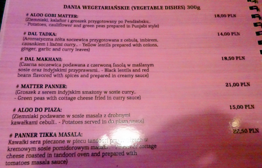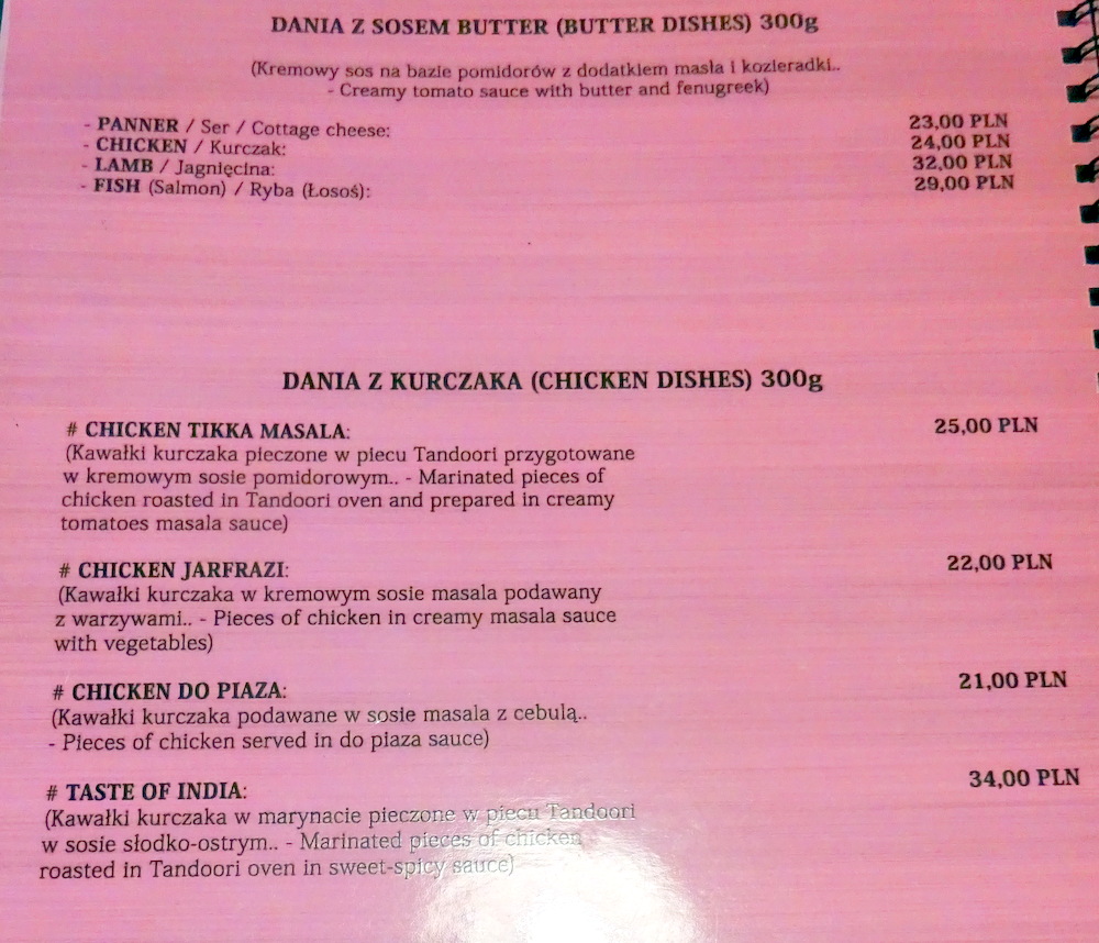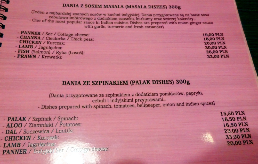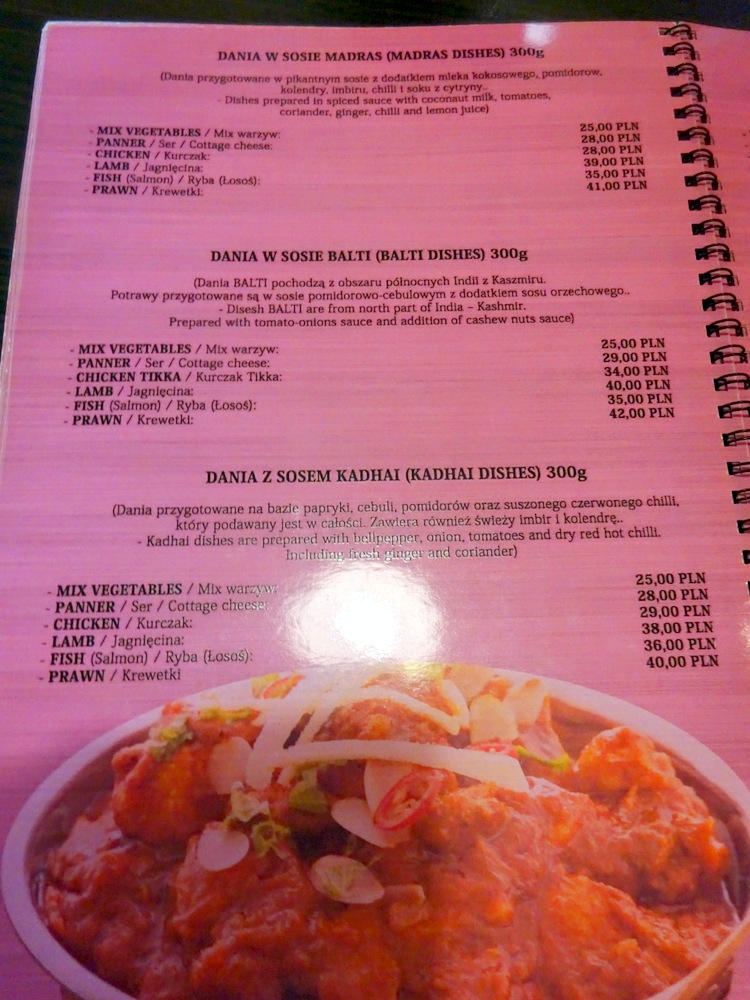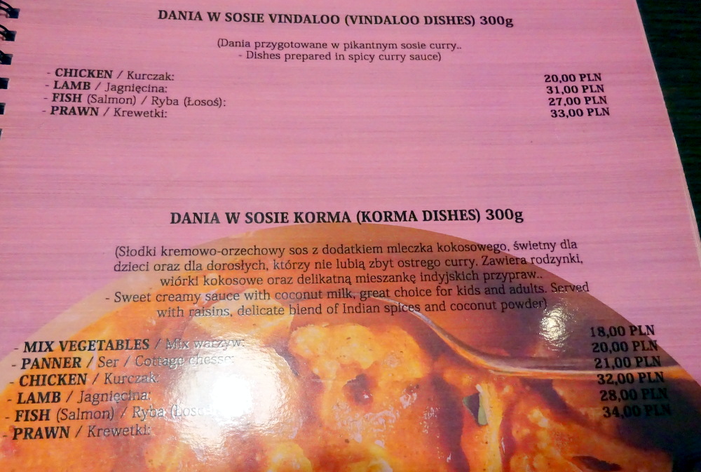 Two other Diners were present when Hector and Marg arrived at Taste of India just after 13.00. The Waiter brought the Menu, as ever, Marg would snack whilst Hector ordered a Main Course. The Menu was efficiently laid out, Madras, Balti, Kadhai, Masala and Palak being the styles of the Main Courses. Each was available as Mix Vegetables, Paneer, Chicken, Lamb, Fish or Prawn as appropriate. On any other day I would have negotiated a Fish Kadhai (36Zl) with my usual tweak. However, it was hours since I enjoyed this at Indus Tandoor. It was time to return to Lamb, I asked the Waiter which was his recommendation between Lamb Dania W Sosie Madras (39Zl) and Lamb Dania Z Sosem Masala (30Zl). Unsurprisingly he favoured the more expensive Dish. I wondered what was in this to justify the differential. I asked him – why.
