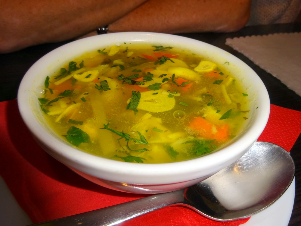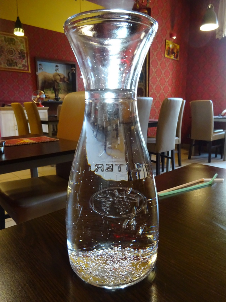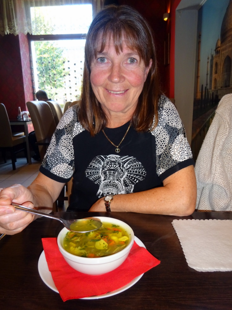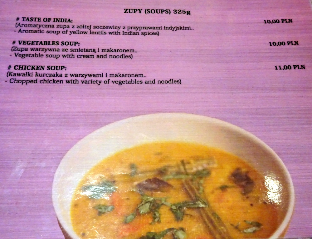 Perhaps inspired by Steve last night at Indus Tandoor, Marg was up for Soup this Lunchtime. She negotiated Vegetable Soup (10Zl) – Mild. How often is one asked – how Spicy – for Soup? Marg asked that her Soup be served at the same time as my Main Course. On asking for a Large Bottle of Sparkling Water, the Waiter suggested a Karafka (10Zl). He had done well, even going as far as confirming that Chillies were fine, it was Green Peppers that should be excluded.