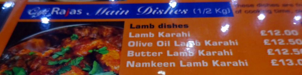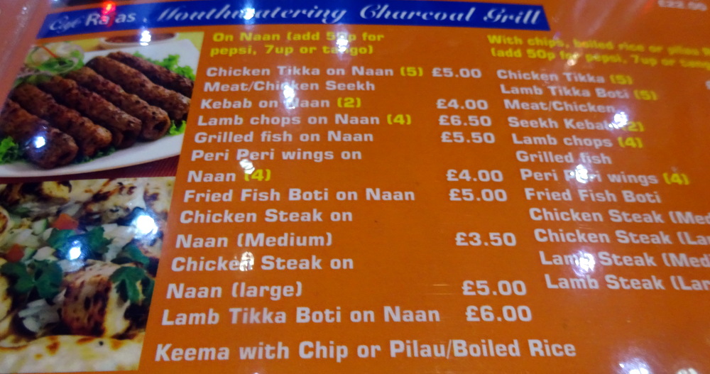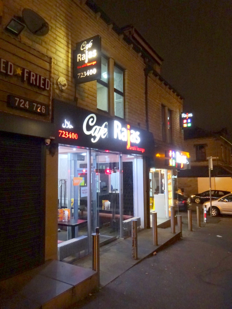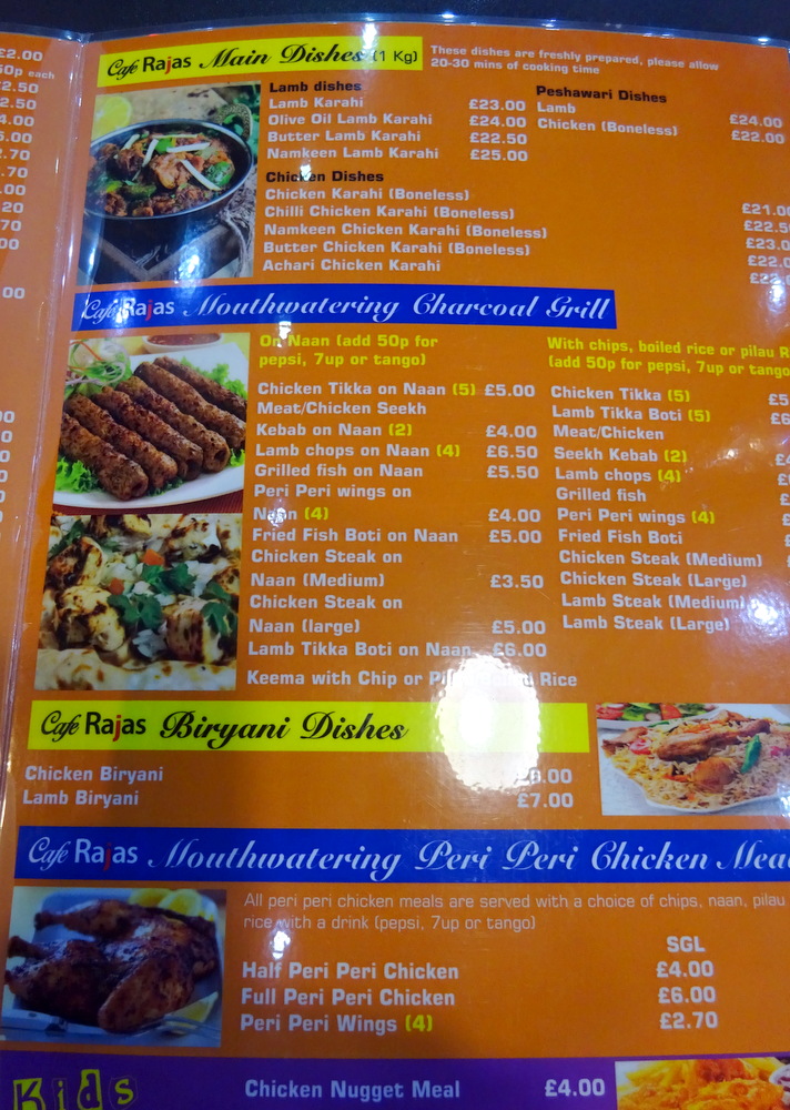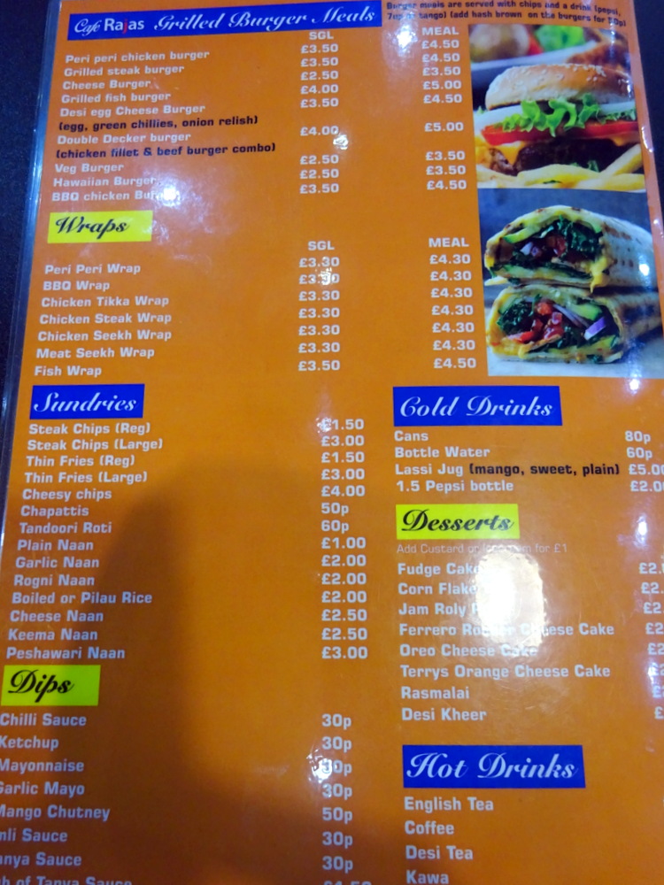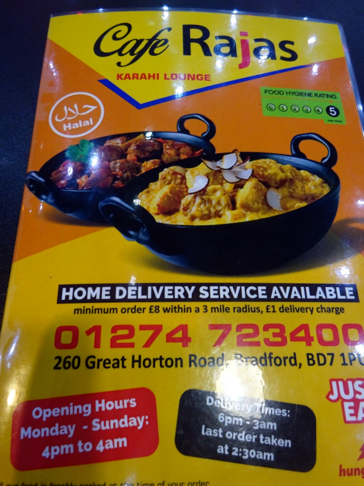 Rajas is a chain across the north of England serving Chicken and Burgers. Cafe Rajas, my chosen venue this evening has identical livery, but the only example I have found serving Curry. There is also the question of the – apostrophe. Other sources have – Raja’s – but that is not on their signage or Menu. Perhaps – The Man from Bradford – will have more information?