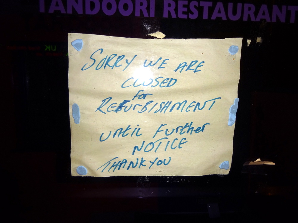Arriving before midnight, I was shocked to find the place in darkness. I had heard that they had issues with a recent hygiene inspection, but closed? Is that what a – Zero Hygiene Rating – demands?