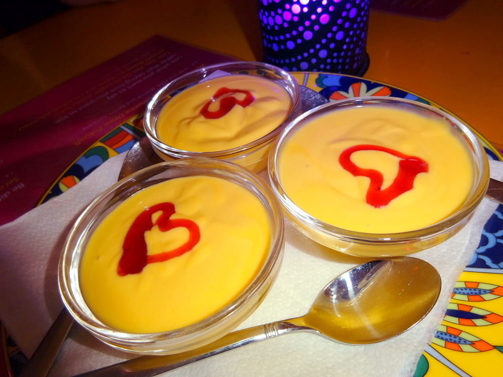Three Soupçon of Mango Lassi were brought. These certainly put out the fire.