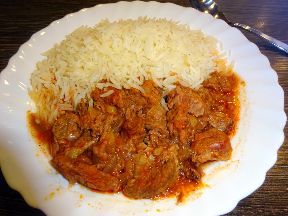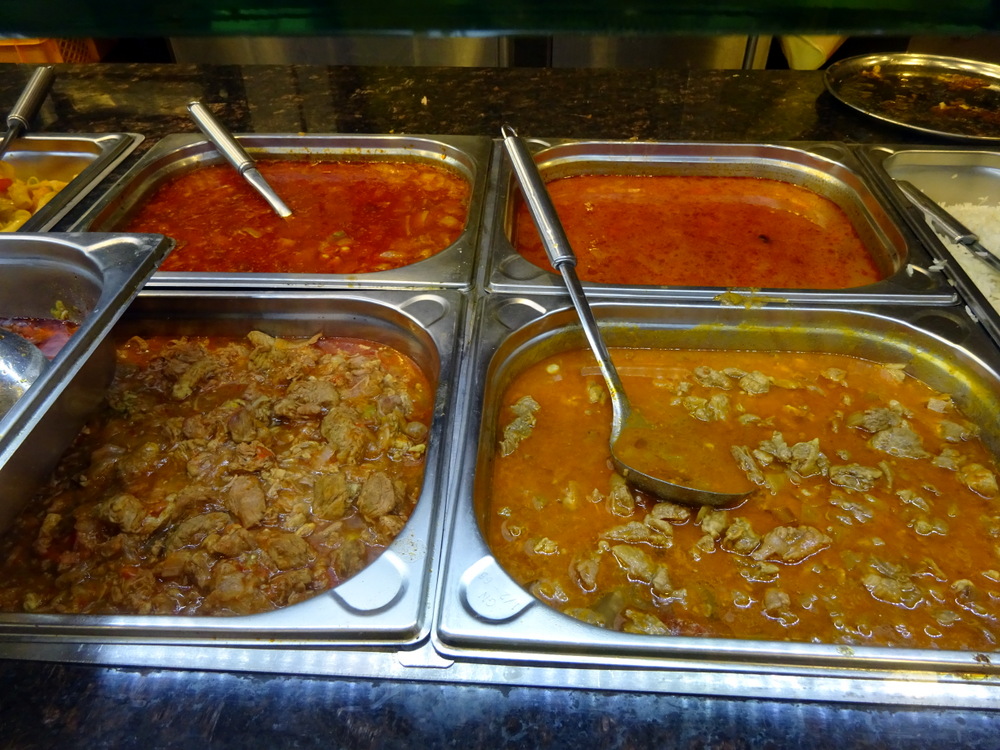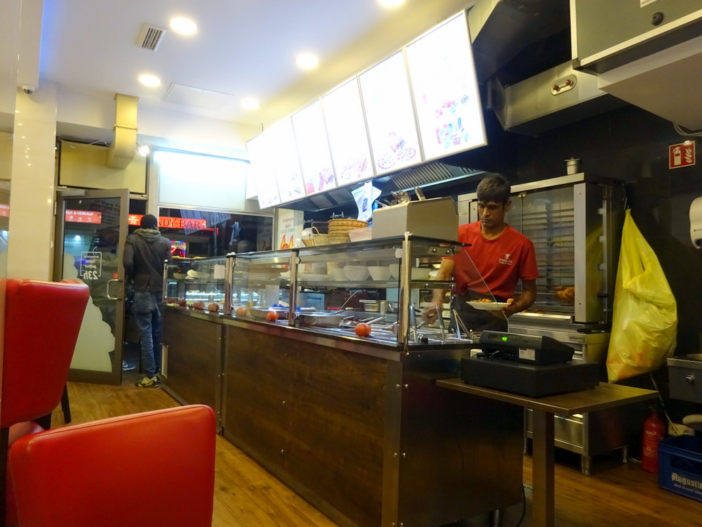 The Kebap Kalb (€4.00) was ordered and paid for. I stood aside to let others approach the counter, then I saw the display of Curry Dishes. Being the time of day/night when Hector’s Deutsch approaches – perfection – I asked for a description of each Curry. Lamm Curry mit Reis – it had to be. I pointed to one of the available tables to confirm I would eat this here.