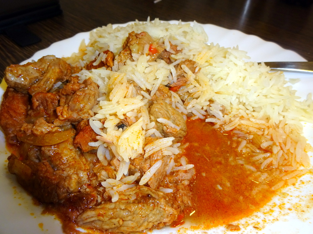 A portion of Lamb Curry and Rice was taken to the kitchen for a reheat.