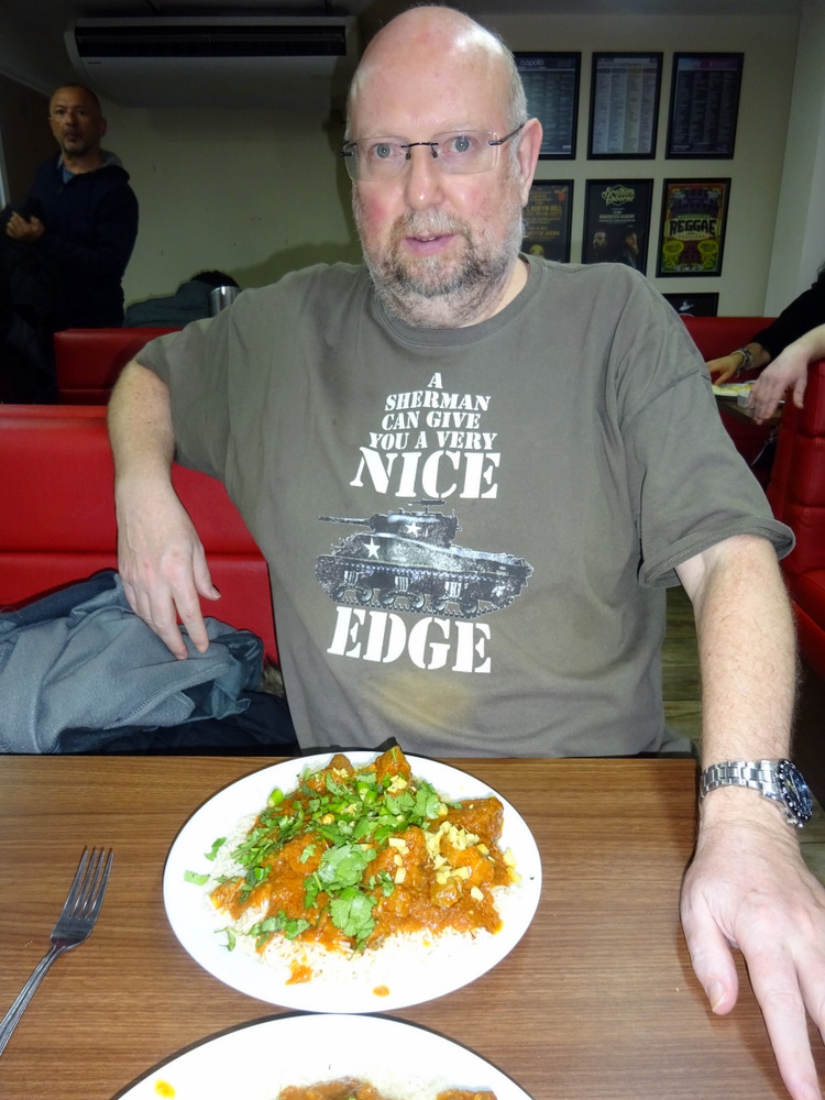 The Kick in the Curry was boosted by the Chillies. Rizwan, or his Chef, has the Seasoning pitched perfectly. I picked out a Clove, Black Peppercorns permeated the Masala. Allowing for the Bones, there was still a huge amount of Meat. A – Sucky Bone – gave up its marrow, joy. Hector ate slowly, these days this is mandatory; the last grains of Rice were Cold. So it goes.