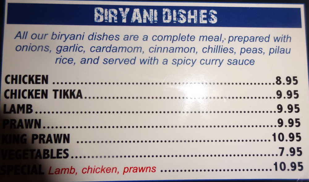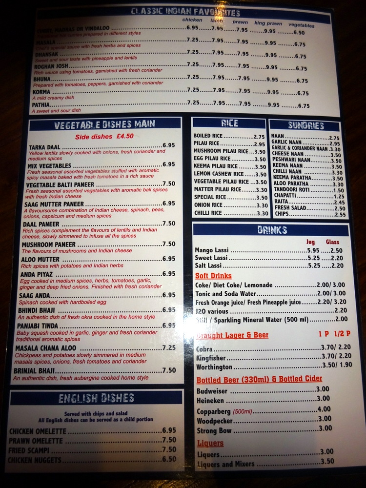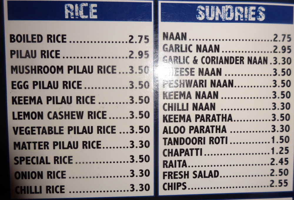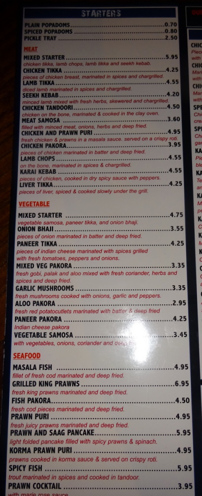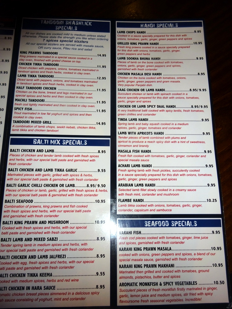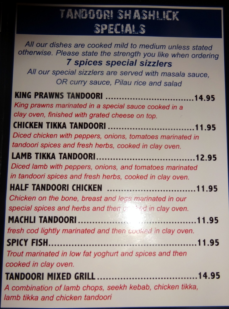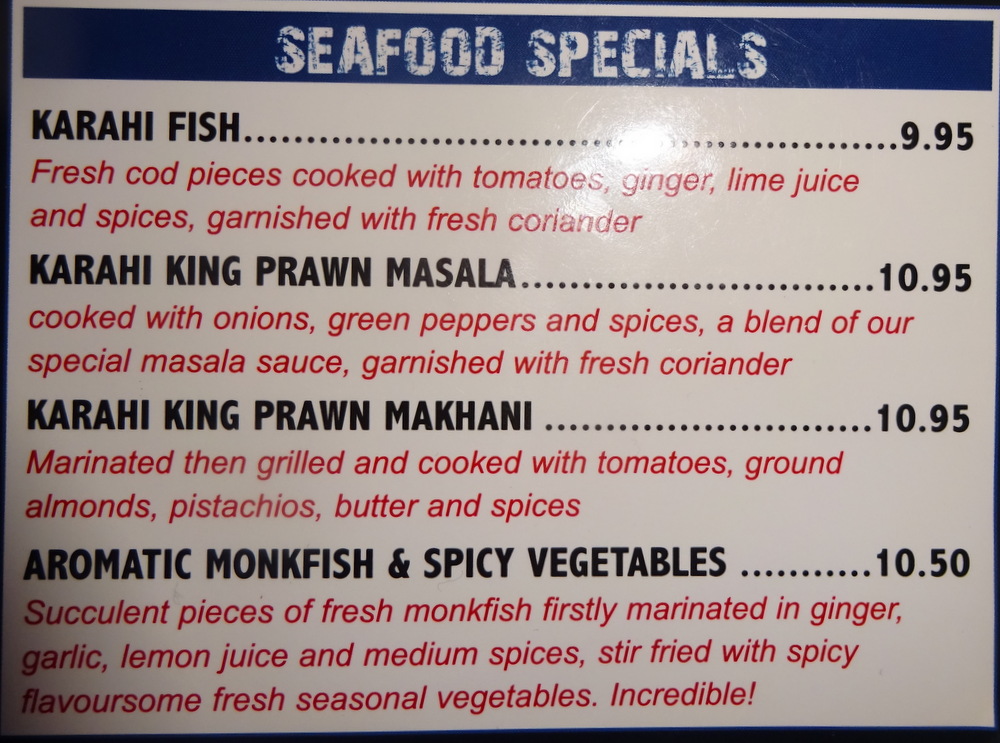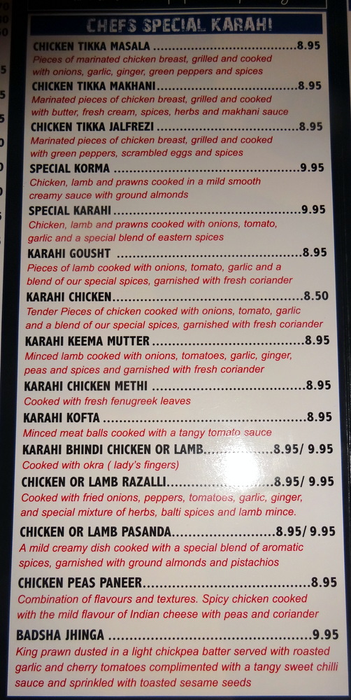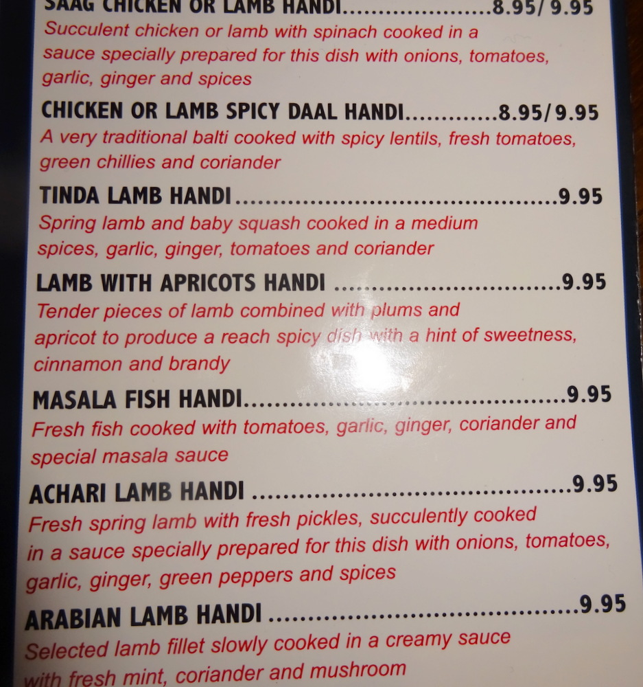 The Menu, posted below, impressed overall. There are many Dishes on offer that are different from the – Mainstream: Arabian Lamb Handi, Aromatic Monkfish & Spicy Vegetables, Lamb with Apricots Handi to name three. More days in Sheffield, anyone?