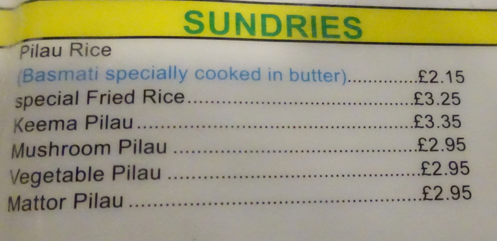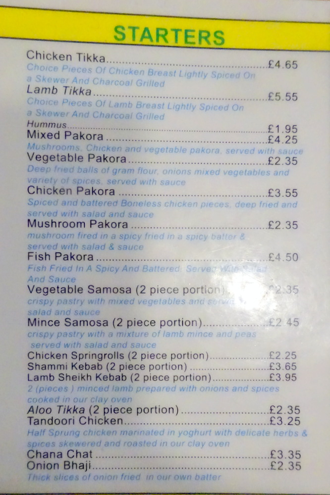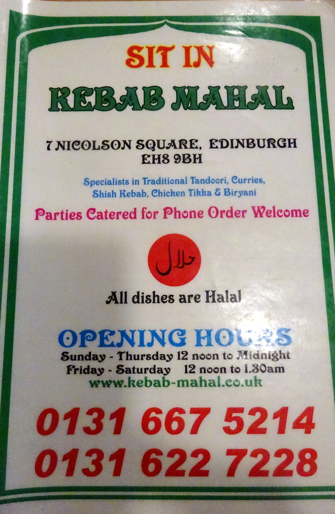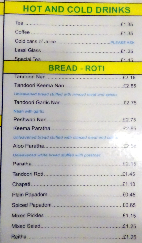 Opening at noon each day makes Kebab Mahal an interesting prospect. Lunch on December 20 was already in the diary, however, a spontaneous trip to Edinburgh today presented an opperchancity. I arrived at 16.10, the place was empty though two takeaway customers were on my tail. A mature gentleman who I would deduce to be Mein Host was serving.