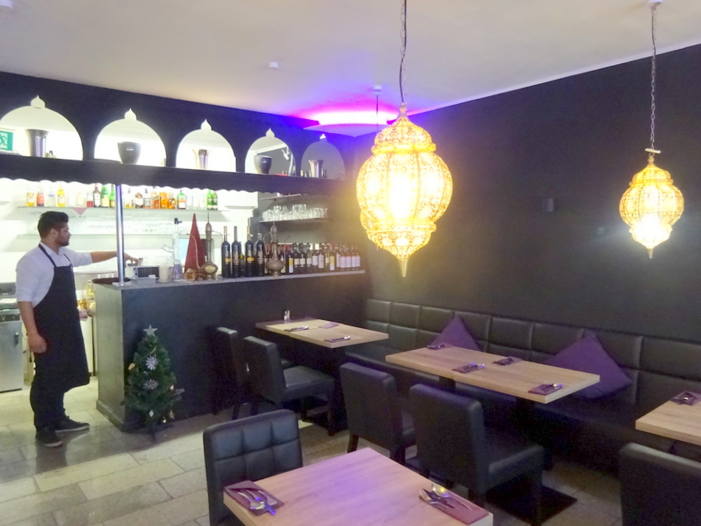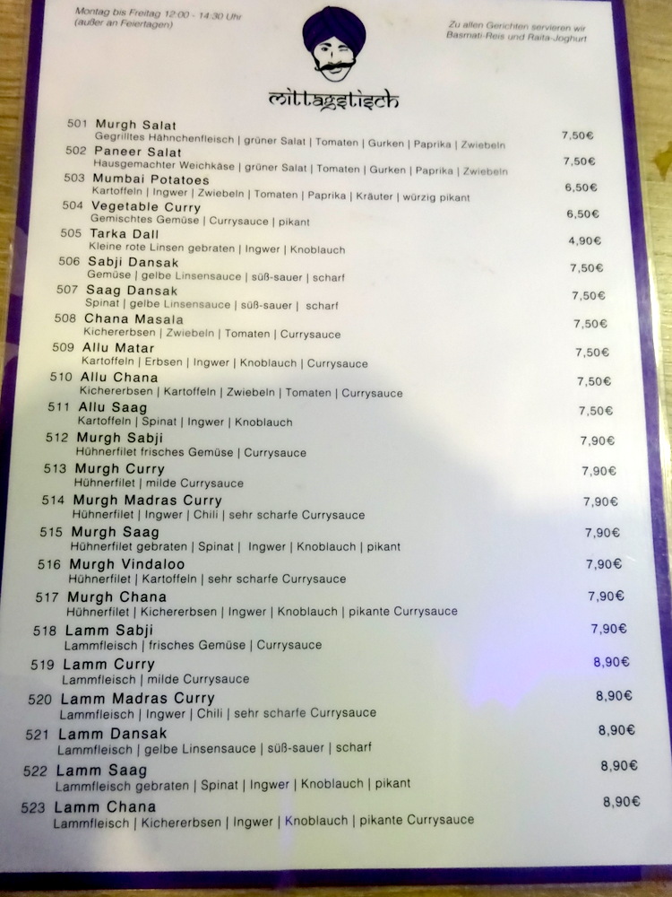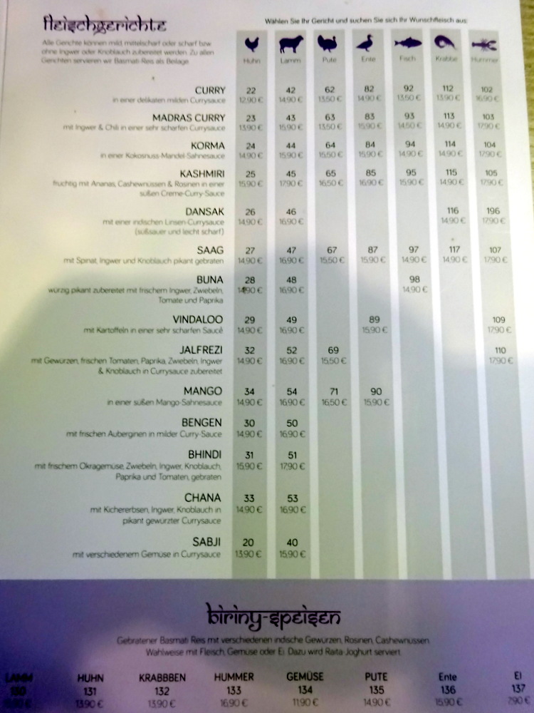 I entered Badmaash at 13.00, the once intensively decorated Curry House was almost Spartan in comparison. A couple of chaps were having coffee or similar, I took the table next to the Bar. The Waiter brought the Mittagstich – Lunchtime Menu. I glanced over this then asked for the Main Menu. The grid of Curry Dishes (below) covered Lamb, Fish, Seafood, Chicken, Turkey and Duck, though not every Curry was available in each format. It became apparent very quickly that the Curry I had settled upon may as well be bought from the cheaper menu.