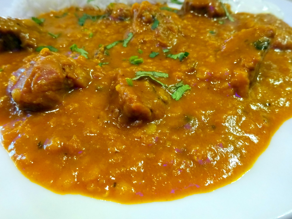 A Tangy Flavour hit the palate from the off, a Curry with a definite Flavour, a good start. The Spice was moderate, the Seasoning was at a very pleasing level hence the immediate impact. The Daal-effect not only added a different Flavour from my usual Curry choices, but aided the Texture. The Meat varied in Quality, some was decidedly Tender, some required a lot of chewing. The final piece took Hector a full ten minutes of mastication which is unheard of. Some of the Lamb shared the same tanginess as the Masala; some gave off an almost unpleasant after-taste. This puzzled, I could not establish if there was a correlation between the Tender Meat and the Chewy Meat with respect to the latter. Fortunately, the majority of this Curry was a positive experience.