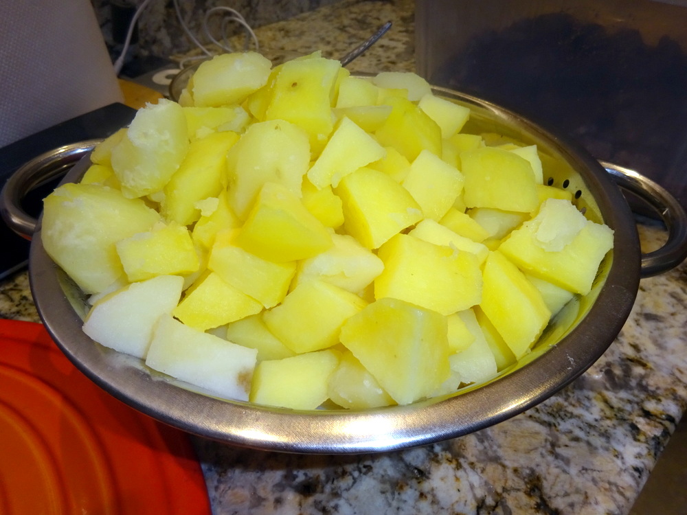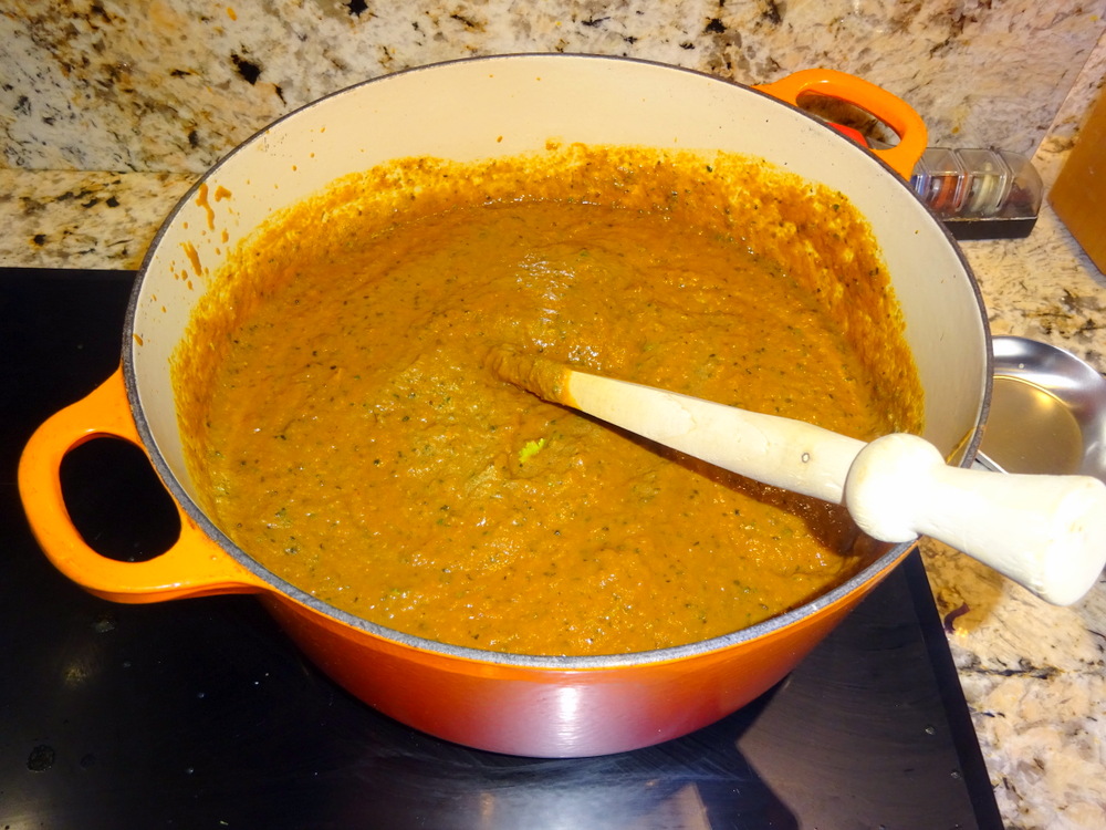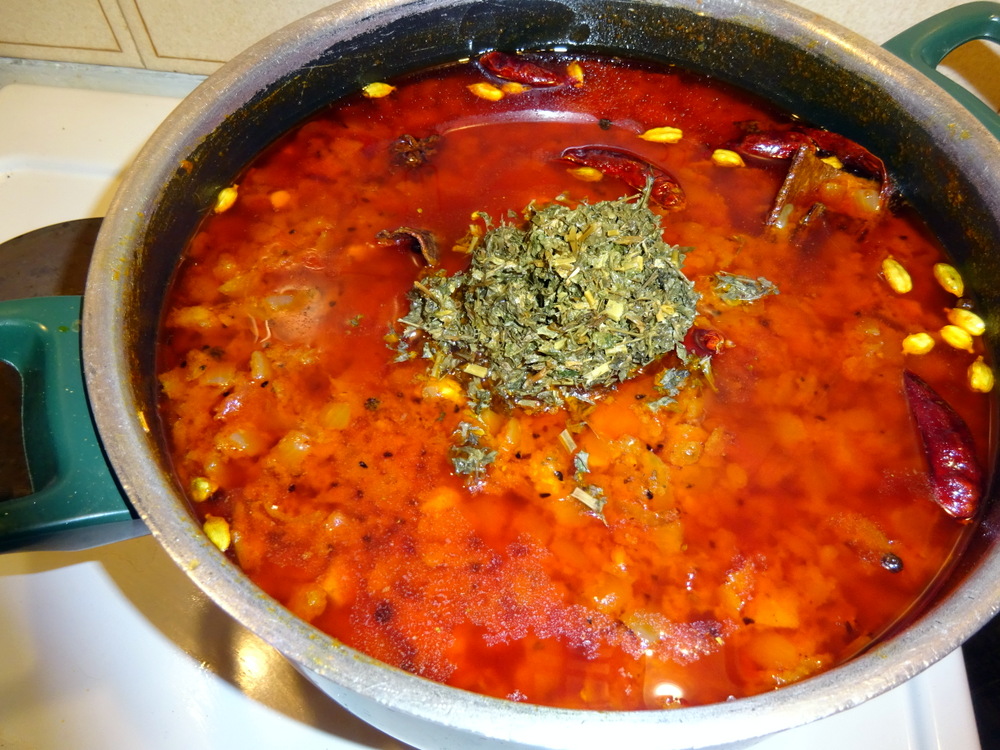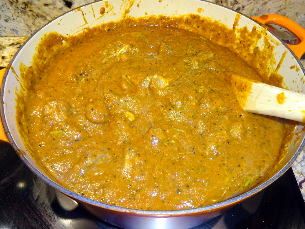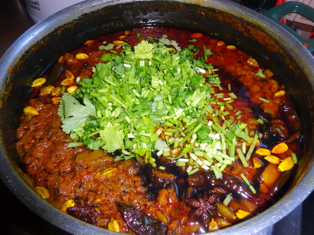 Hector still had work to do on arrival. A ton of Potatoes were peeled and chopped into bite-sized pieces then boiled. Hector takes no chances with Potatoes, the – Aloo. I decided to blend the Masala to create the classic BIR Masala. Beforehand, more Oil was poured off. Coriander Stems were added. These, the Green Cardamom and Red Chillies would disappear in the blended Masala which came out looking very much like – Soup.