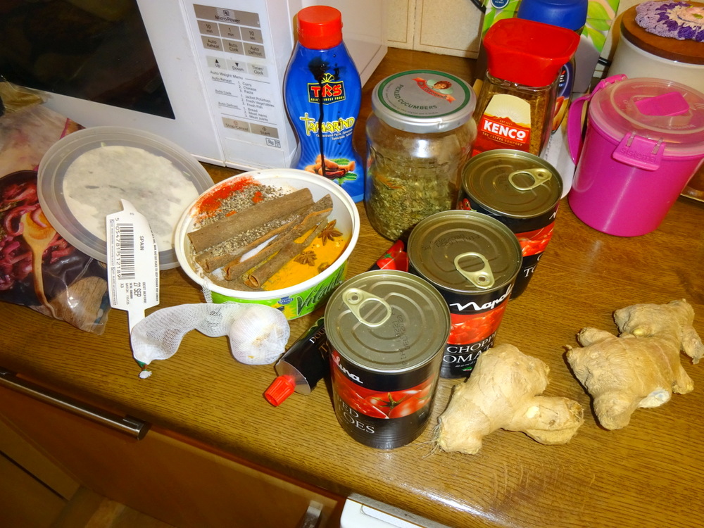 The Spices were assembled on December 24th before driving north to Aberdoom where for once no Curry Houses were visited. This was a short stay. Both Sainsburys and ASDA had to be visited yesterday in an attempt to secure the necessary fresh ingredients, no Fresh Coriander or Chillies. The Masala was cooked last night, two hours of cooking the Frozen Onions before adding the Tomatoes, Spices and saturated Methi.