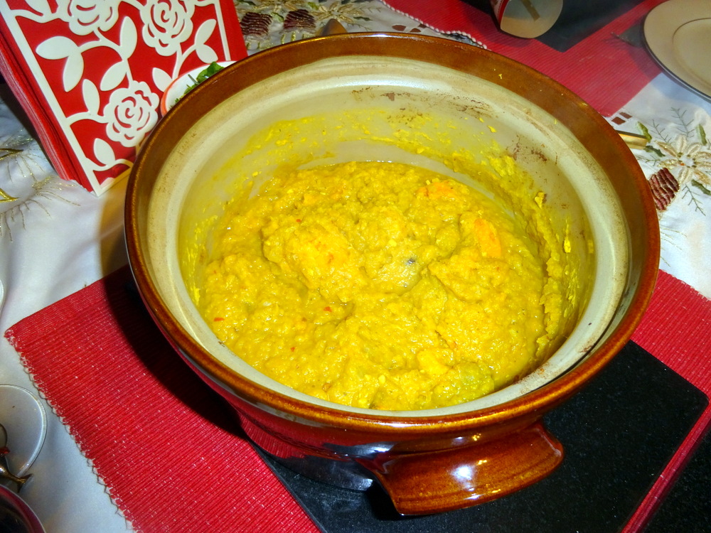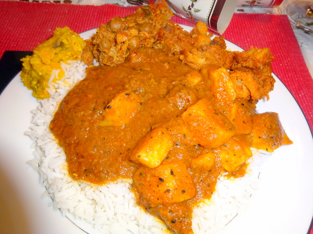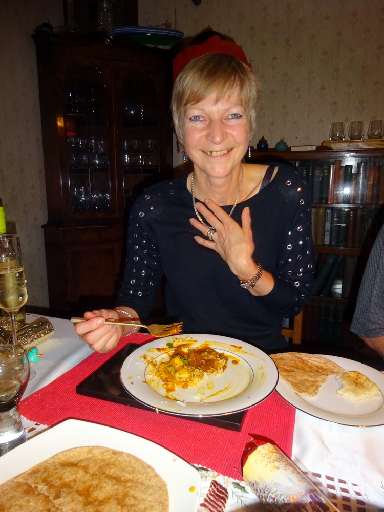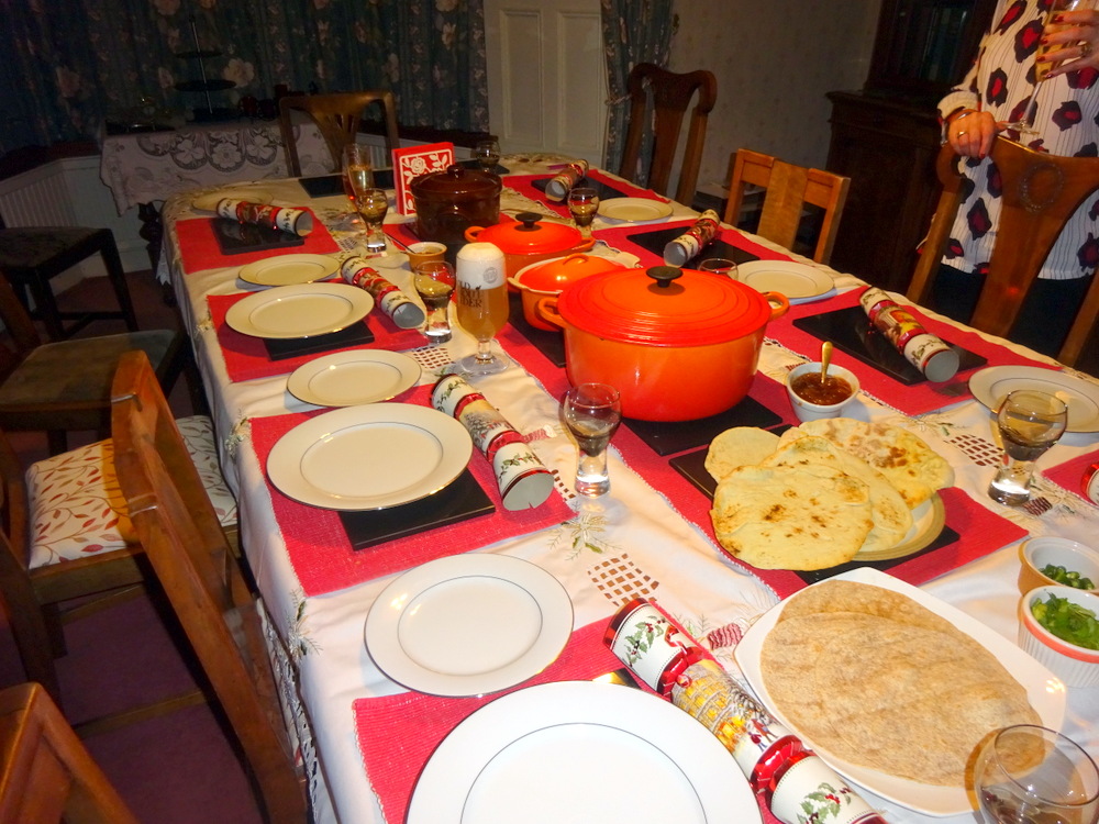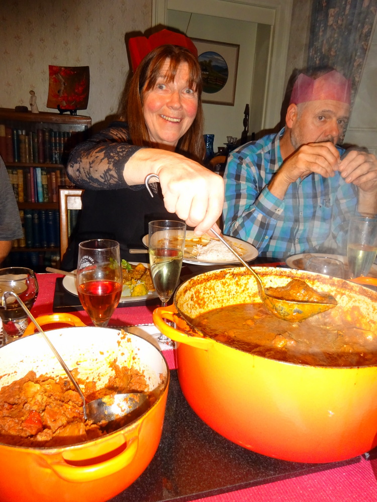 18.30 was the agreed time that – Dinner – would commence. We would be nine, with one Vegetarian. Mags, our co-host – had three leftover Dishes from December 24th, all Vegetarian: a Bombay Aloo cooked by Fiona (not present), plus Mags’ Sweet Potato and Lentil Daal, and finally a Chickpea and Cauliflower Mash. All were very Dry, in Hector’s preferred style.