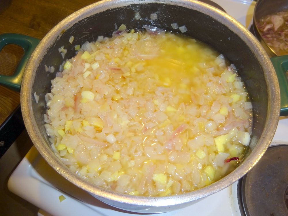 The Pork was added and cooked for half an hour, longer than anticipated as Marg said it needed more after the first ten minutes. Somewhere in the mist of time the Potatoes were added. Mags put the Pork Vindaloo into the oven and made a very poignant comment as she did so: