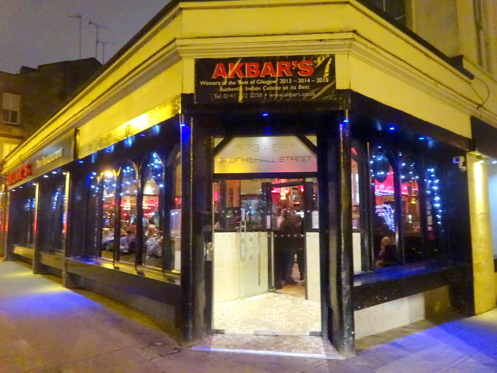 Akbar’s (573-581 Sauchiehall Street, Glasgow G3 7PQ) was not the first venue which came to mind. Initially Marg considered Mother India’s Cafe, it has been a while since she has enjoyed her favourite Curry anywhere – Butter Chicken – as served there. Hector pointed out that one cannot book at Mother India’s Cafe and it would be a Saturday night. Mother India, the Restaurant, was then mooted but quickly dismissed. Marg has found their full portion of Butter Chicken to be – too much – and also recalled our only visit in the Curry-Heute era when they ruined Hector’s Birthday Meal.