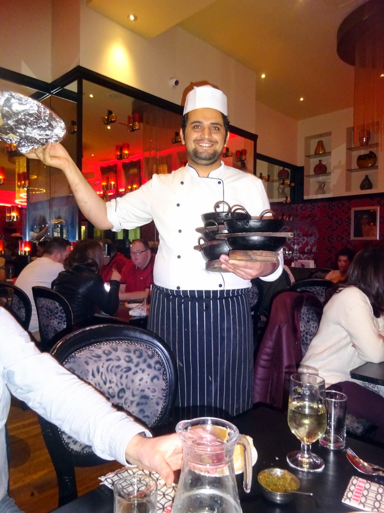 One hates when the Mains arrive too soon, there was a suitable wait. The place was full except on my immediate right where a table for a large group was being set up. The Waitress came over to say our Mains would arrive in a few minutes. In the earliest days at Akbar’s they would quote a precise number, very silly. By the time the would-be Chef who brings the Mains arrived, we were ready. As always, he was happy to pose. It actually took three people to bring the entire order, a Waiter asked me to verify that everything had been delivered. All was well.