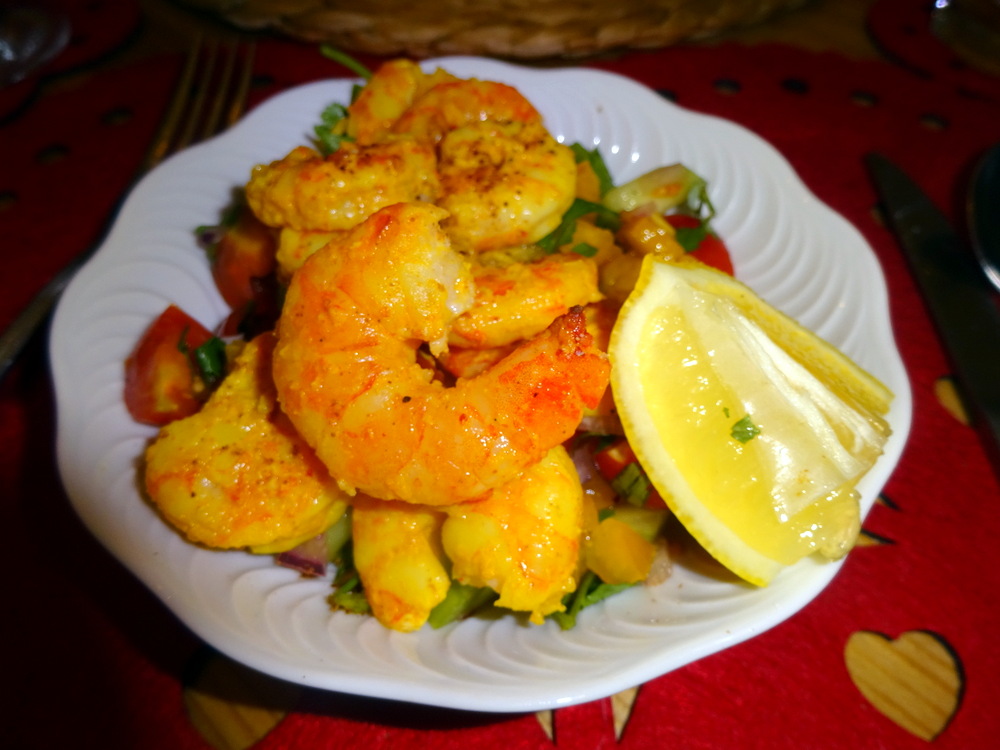 This was a Starter from Steve’s imagination. The Prawns were marinaded with Chilli Powder featuring prominently. Beneath the Prawns were finely chopped Vegetables including Yellow Capsicum, Steve trying to wind up Hector? No comment was made. There was a – Kick – a pronounced – Kick.
