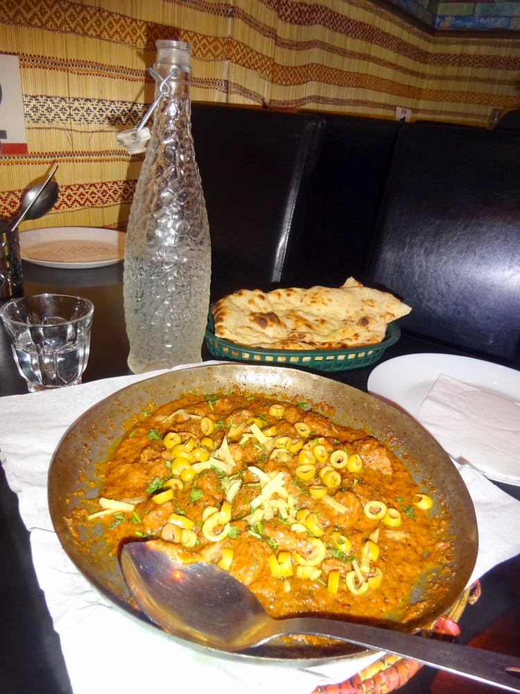 With the majority of Dera still in semi-darkness, the Chap came over to serve. On asking the difference between the two versions he got stuck on telling me – Boneless. Eventually I extracted – Olive – from him. It took three attempts to communicate Zaitoon Lamb Karahi on-the-bone with a Naan (£1.25) to accompany. Who is not going to have a Naan at this price? (A Roti is £0.85.)