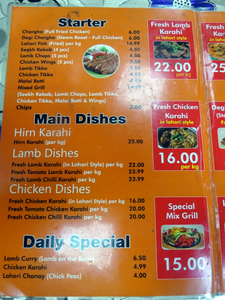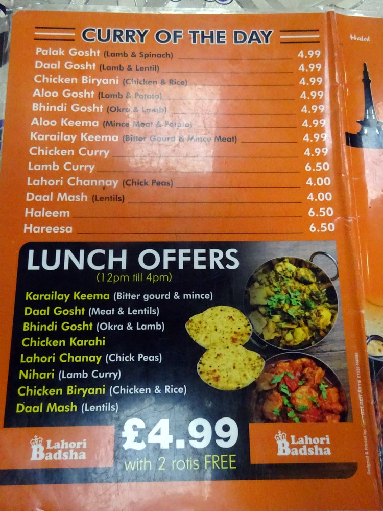 Arriving at 14.15 I found one Diner finishing his lunch. The same Chap behind the counter raised his eyebrows in acknowledgement as I took a seat well away from the door. Another Chap brought the Menu. Daily Special, Lunch Offers, Curry Of The Day, Karahi is only sold by the Kilo. Lamb Chops, £5.50 for five. Where to begin?